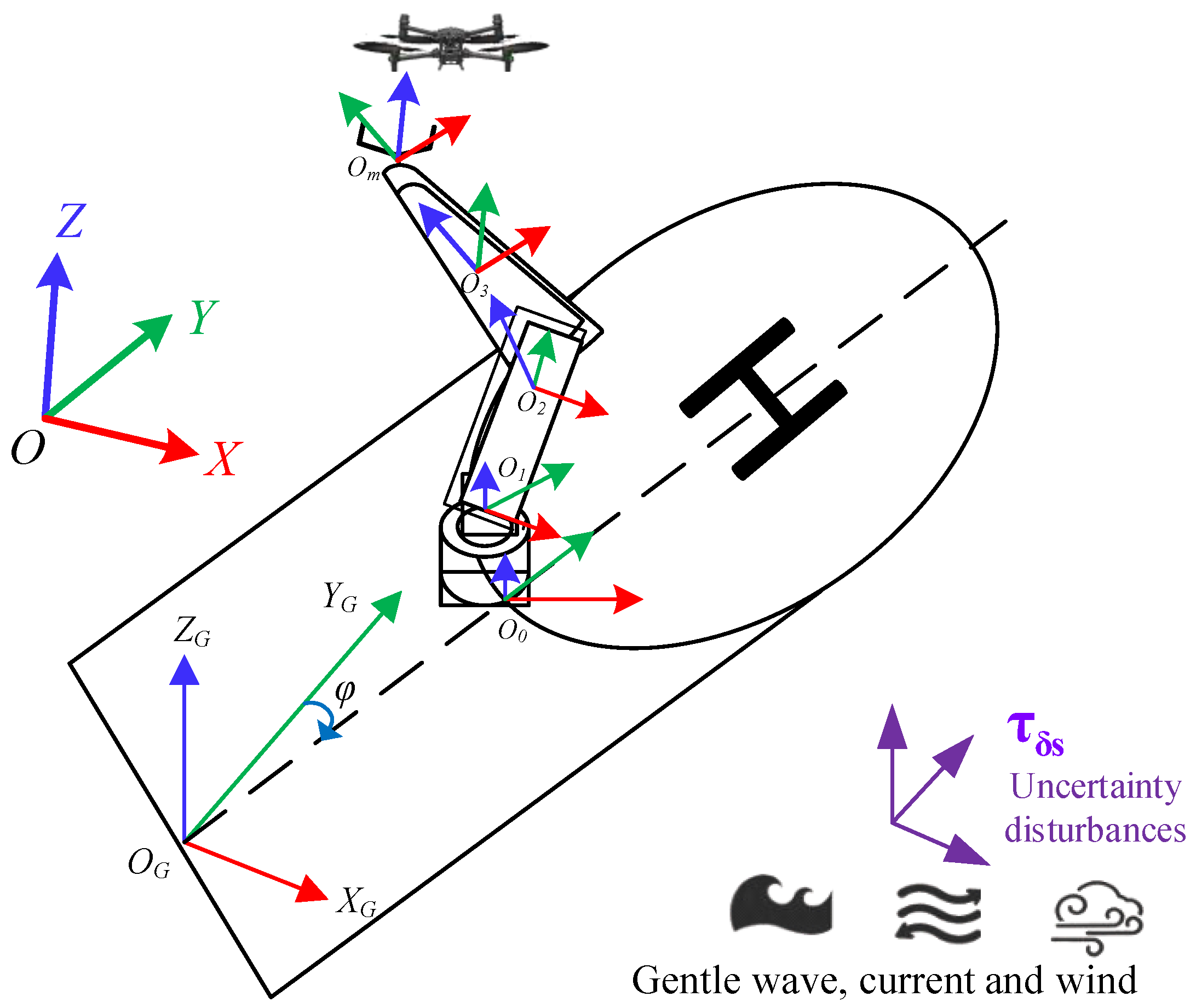 This paper is organized as follows: Section 2 introduces a global Jacobian matrix of the shipborne manipulator arm and its global mathematical model. In Section 3, a down-to-top grasp docking paradigm is proposed to stabilize UAV-assisted landing by the end-effector of the shipborne manipulator arm. Experimental results and discussions are also given in this section. Conclusions are drawn in Section 4.