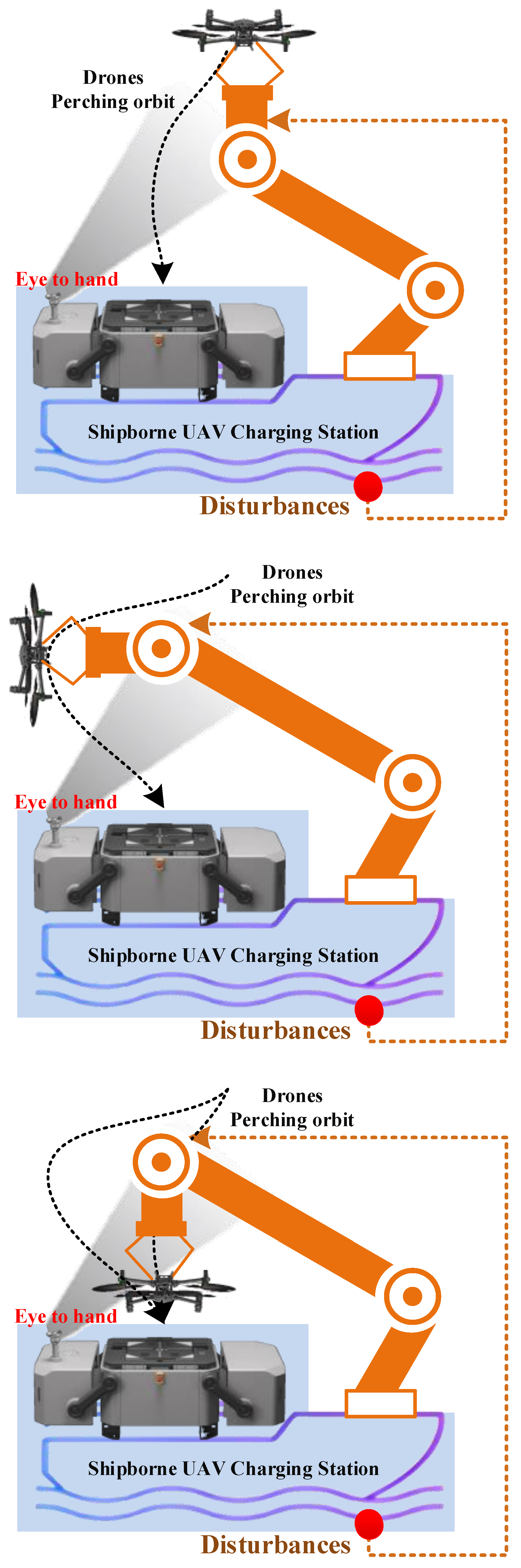 (1) Aiming at the uncertainty of gentle wave, current, or gentle wind disturbance problems faced by UAVs when landing on a water surface, we present the first manipulator arm designed for charging shipborne drones that utilize low-altitude visual servo grasp-docking to land their UAV on the water surface.