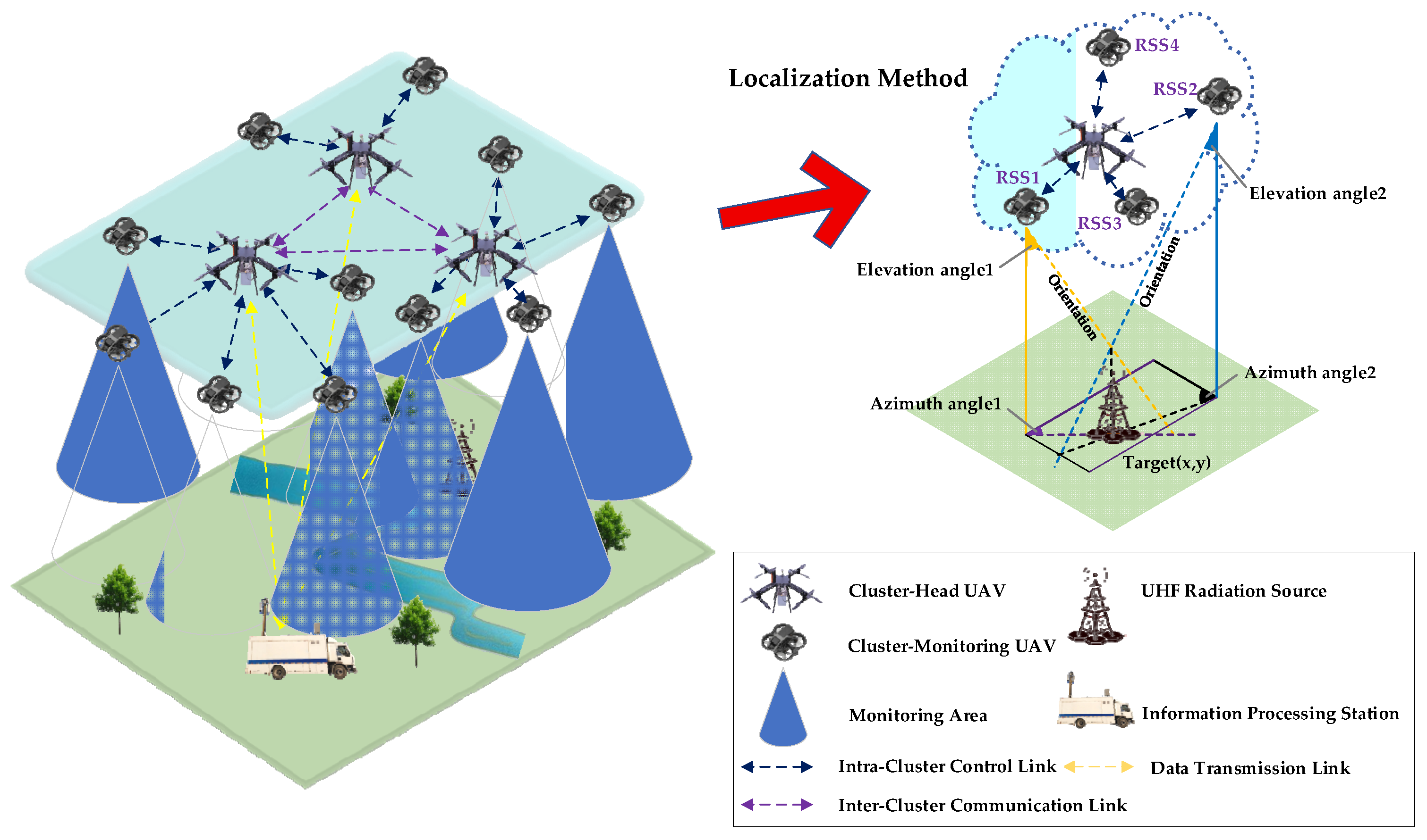 - We establish a large-scale, distributed cooperative sensing and localization framework for heterogeneous UAV swarms to enhance collaborative localization efficiency.