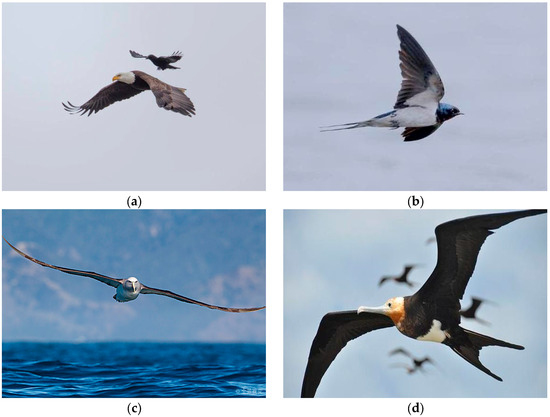 Common bionic objects. (a) Eagle; (b) Swift; (c) Albatross; (d) Frigatebird.