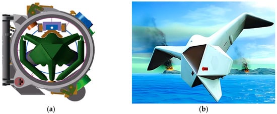 Lockheed Martin’s Cormorant submarine-launched uncrewed aerial vehicle. (a) Folded state, suitable for submarine launch tubes; (b) Unfolded state, used for air cruise. Reprinted with permission from Ref. [25]. Copyright 2013, Weisshaar T.A.