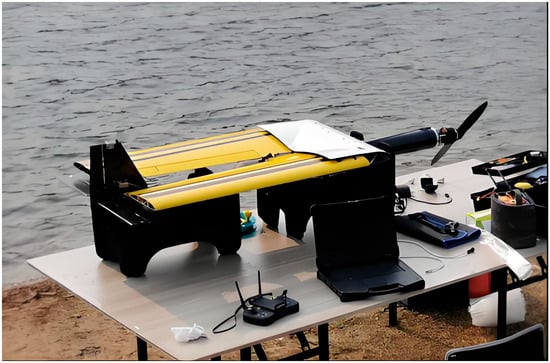 In 2022, Harbin Engineering University developed the “Longbow 2” (see Figure 7). This model features a variable-sweep wing design, with a wingspan of 2.5 m and a fuselage length of 1.9 m. It is equipped with an oil-electric hybrid propulsion system: The propeller is driven by a piston engine in the air, with a cruising speed of 120 km/h and an endurance of 120 min. Underwater, it switches to electric propulsion, reaching 3 m/s and a maximum diving depth of 30 m. The variable swept-back wing technology adopted by “Longbow 2” further integrates an adaptive adjustment algorithm. It collects parameters such as airspeed, water speed, and medium density in real time via sensors. It automatically matches the optimal swept-back angle of 20° during air cruise, with a lift-to-drag ratio of 14. When submerged, the sweepback Angle is 60°, and the underwater drag coefficient is only 0.08. Tests show that this adaptive adjustment can increase the attitude stability by 30% during the medium conversion process [40].