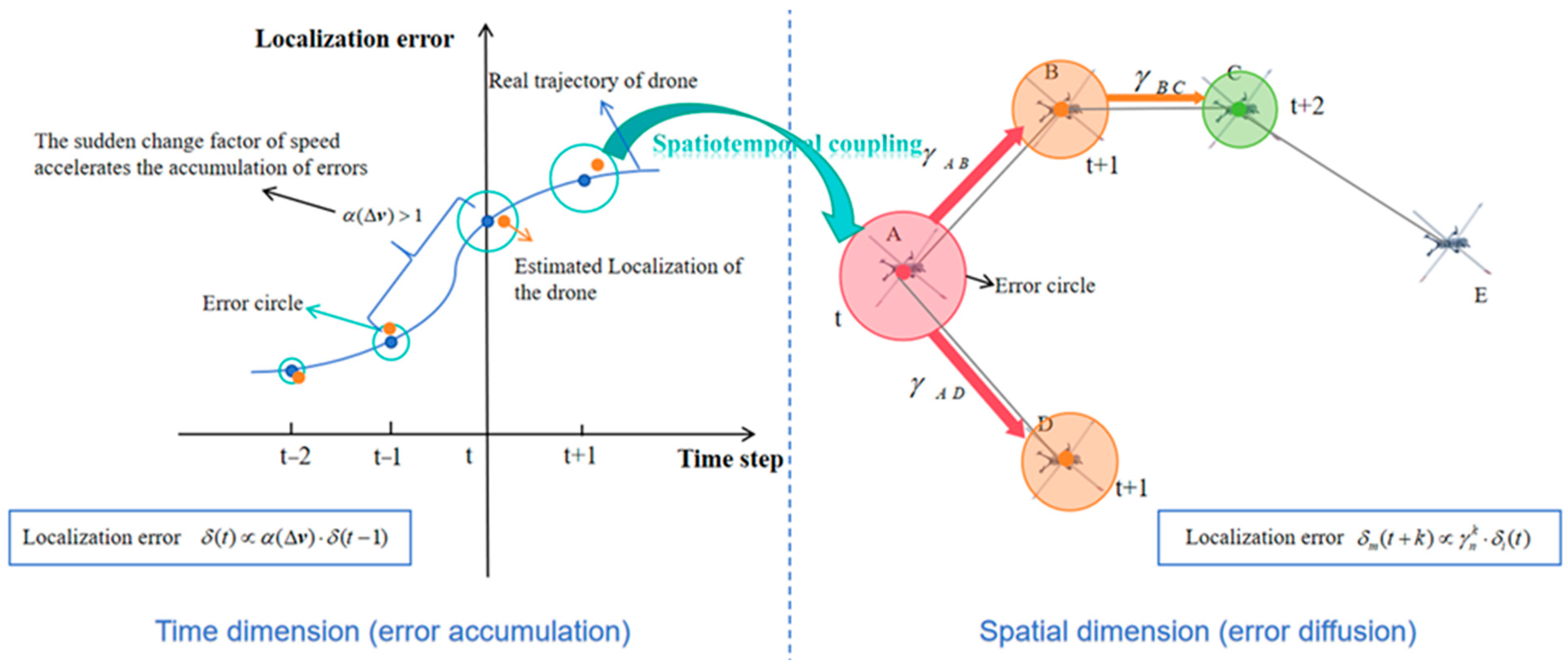 In drone swarms under dynamic topology, the spatio-temporal coupling effect of the ranging error is characterized by nonlinear accumulation in the temporal dimension and multi-hop diffusion in the spatial dimension, as shown in