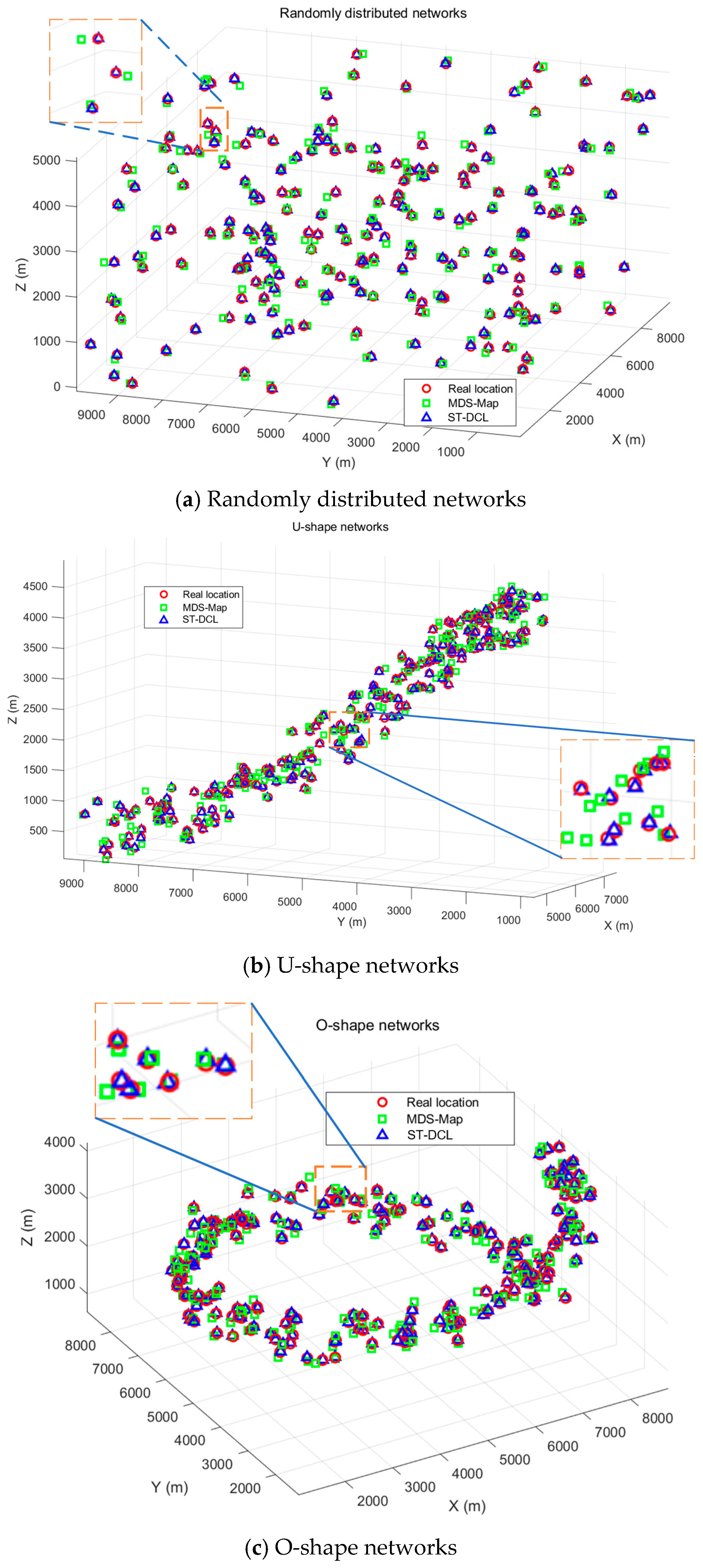 . After statistics, we obtained the localization results of nodes with the MDS-MAP and the ST-DCL method in randomly distributed networks, U-shape networks, and O-shape networks, as shown in