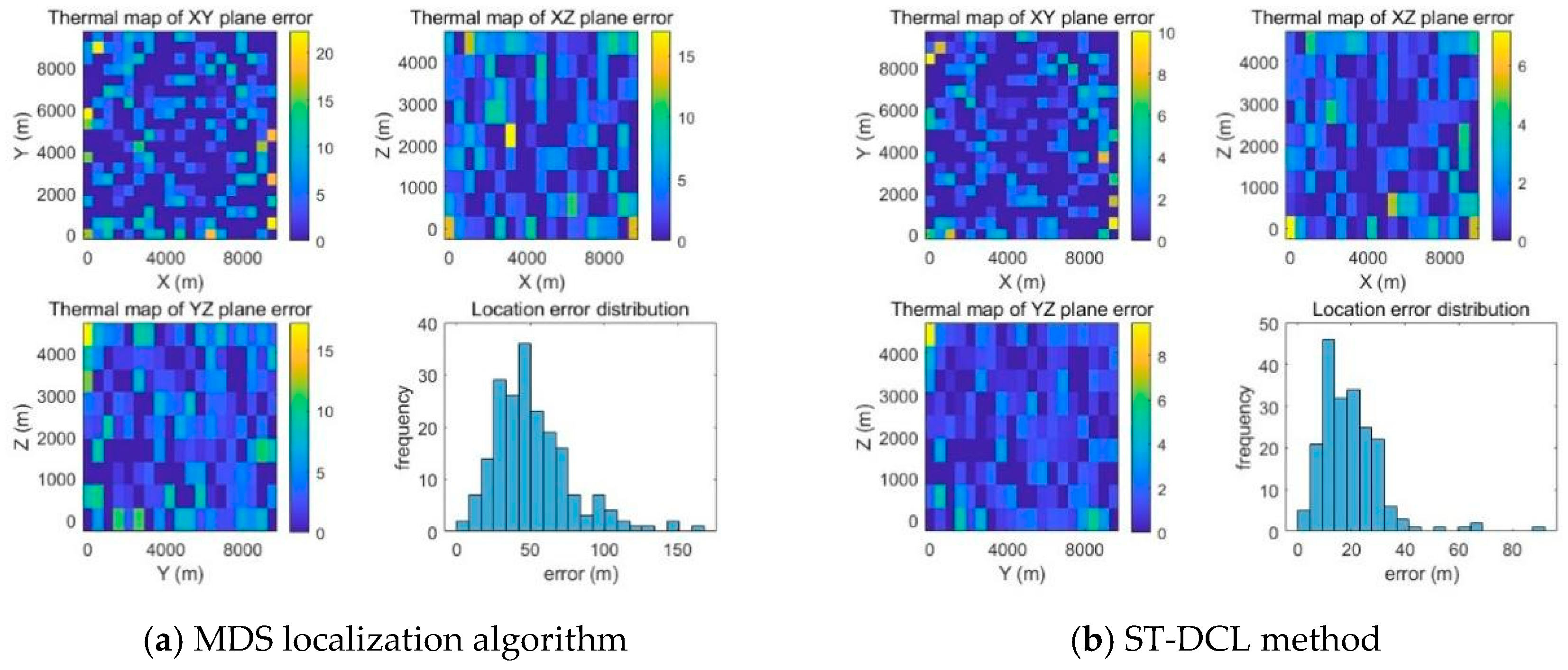 Meanwhile, the nodes in randomly distributed networks were taken as an example to present the thermal map and distribution map of localization errors with the ST-DCL method and the classical MDS algorithm.