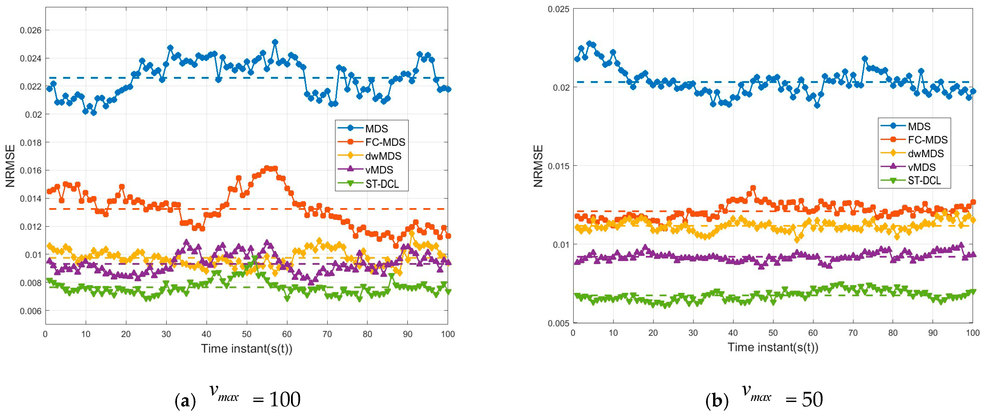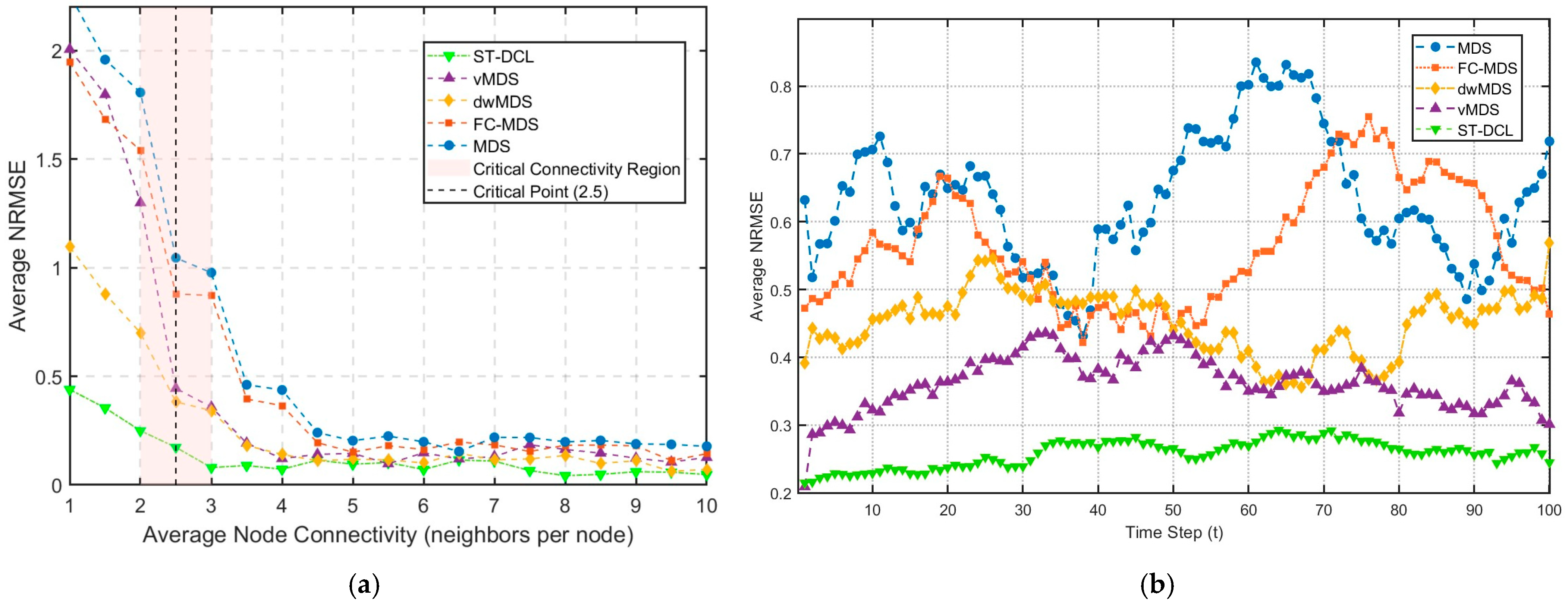 Figure 6a,b, the five algorithms show a similar trend. The average NRMSE performance of the ST-DCL method was 0.0077 and 0.0068, respectively, so that the algorithm always maintained the optimal performance. The ST-DCL method has the capability of a fast response, and its topology attention can instantaneously suppress links of poor quality. In this way, it can prevent the intense diffusion of errors. Moreover, it is capable of closed-loop feedback and nonlinear correction, lowering the error quickly. As a centralized algorithm, MDS uses the distance of the shortest path instead of the actual distance to constitute a distance matrix, which is the main source of errors. The algorithm FC-MDS employs the strategy of iterative refinement to generate local mapping at each node, which results in excessive local mapping in networks. The algorithm vMDS mainly focuses on temporal smoothing. The trajectory smoothing term is adopted to prevent the abrupt change in estimates in the temporal dimension, but it is difficult to cope with the error caused by multi-hop propagation in space. The algorithm dwMDS attaches importance to spatial weight but lacks the explicit temporal handling mechanism.