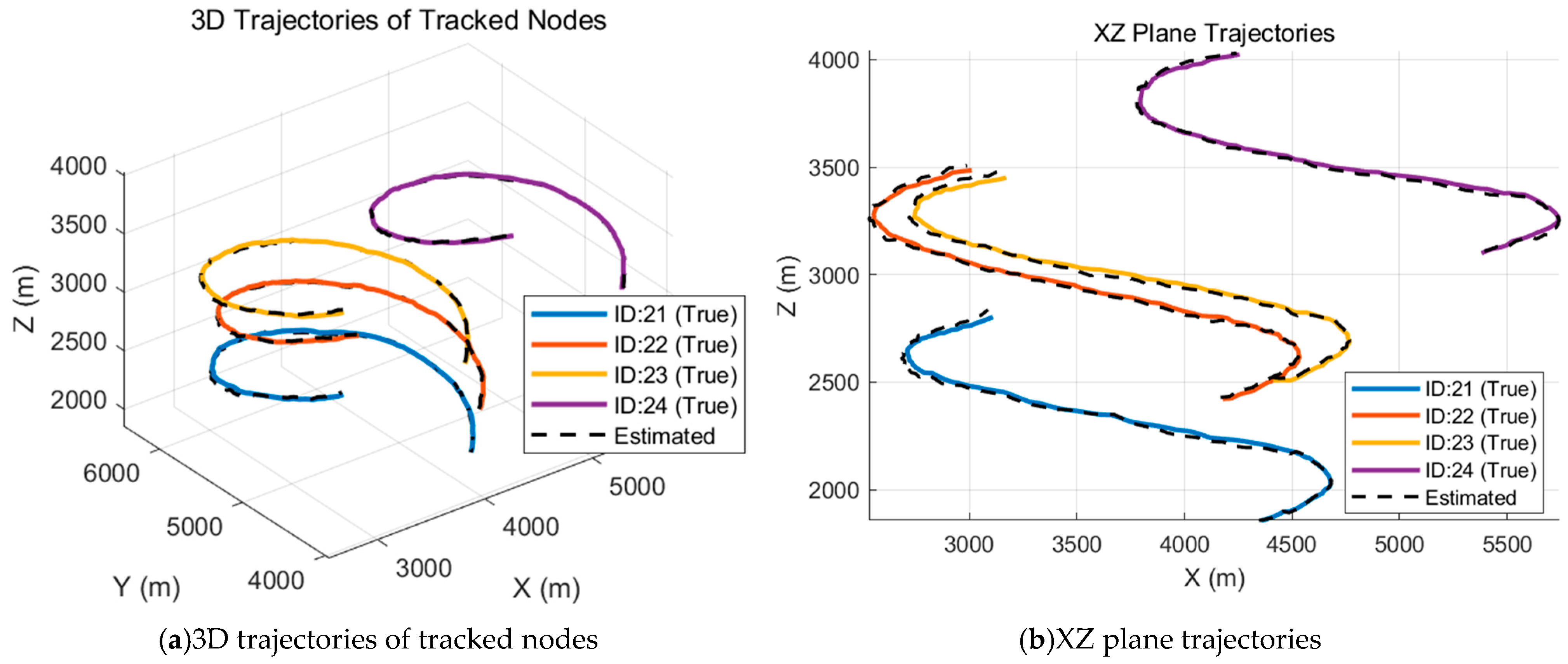 Figure 7b, the ZX plane is selected, and the trajectories of nodes in the plane can more vividly demonstrate the estimated performance of the proposed method.
