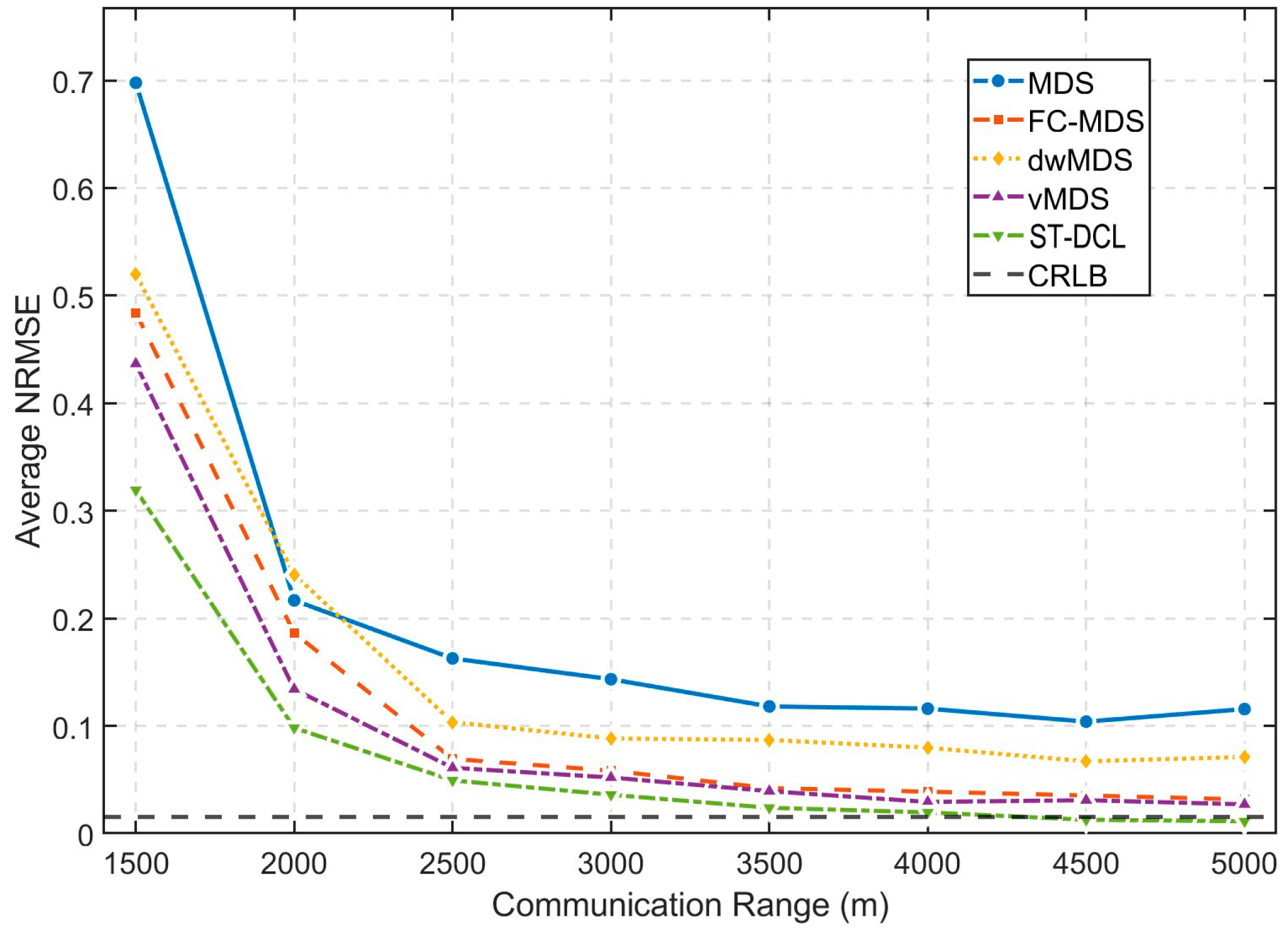 Figure 8, the NRMSE performance of the algorithms is presented with different radii of communication R in randomly distributed networks. By increasing the radius of communication, the NRMSE of these algorithms decreases. When R = 3500, the NRMSE performance of the ST-DCL method is close to CRLB. When the radius of communication R exceeds 2500, the algorithm vMDS needs to cache two-hop neighbors for nodes so that it gradually degenerates into a centralized algorithm. Its NRMSE performance is not much different from that of the ST-DCL method. On the whole, the ST-DCL method delivers the optimal NRMSE performance.