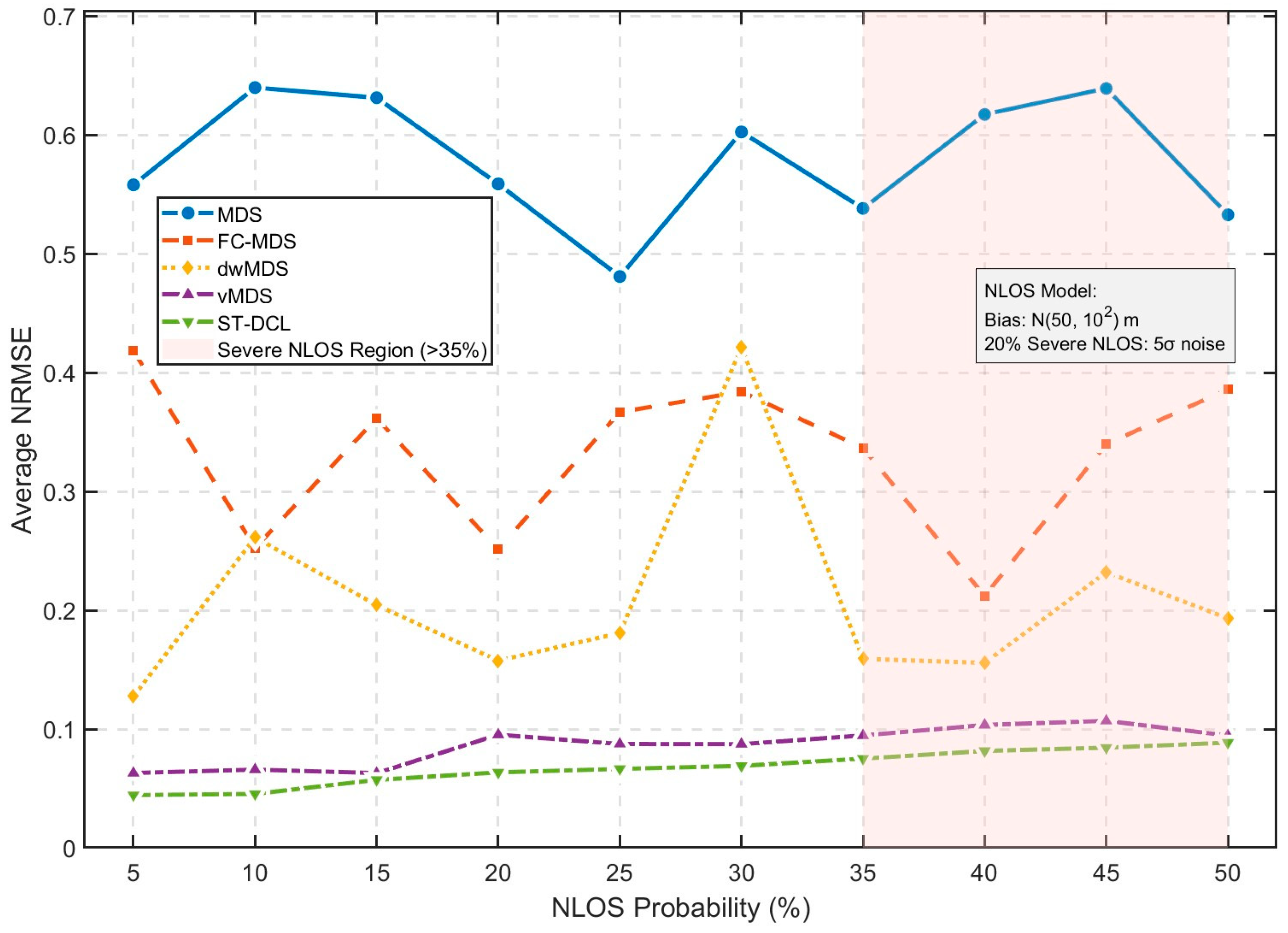 N = 200. The proposed ST-DCL method was compared with classical MDS, FC-MDS, dwMDS, and vMDS, which are currently popular in terms of performance. The NRMSE performance of these algorithms varied with time (t ∈ [1, 100]), as shown in