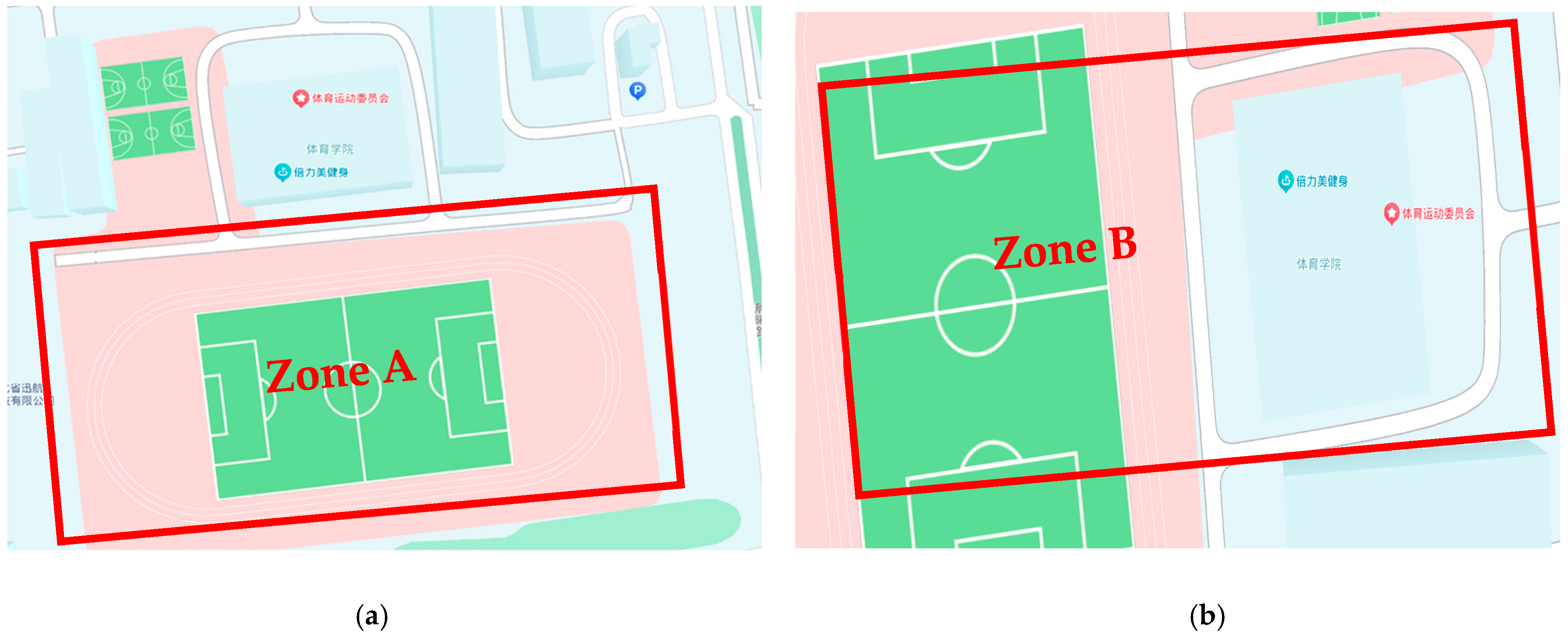 2. Zone B (Perimeter of a Multi-Story Academic Building): A challenging zone featuring dense obstacles. Concrete walls induce severe NLOS attenuation and complete signal occlusion, while also creating strong GPS multipath interference. This zone is instrumental for stress-testing NLOS resilience.