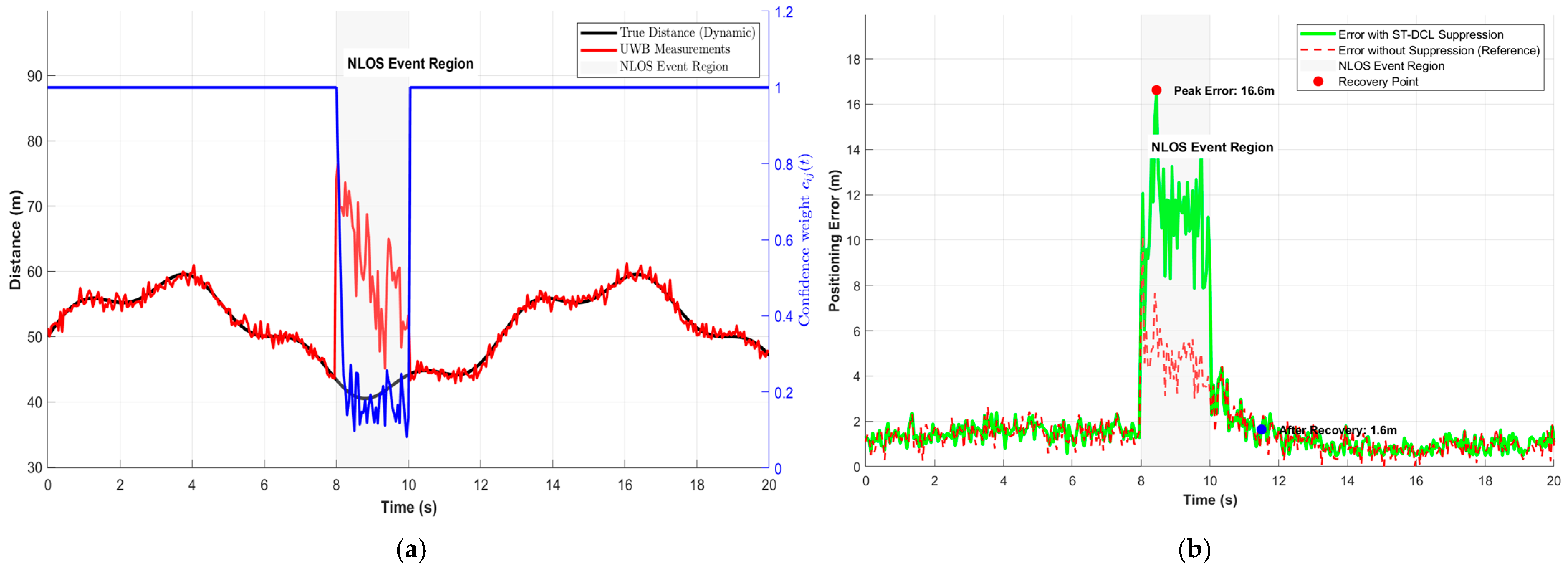 Figure 14a illustrates three key variables: the GPS-RTK reference distance reflecting true relative motion (black line), the raw UWB ranging measurements containing significant NLOS bias (red line), and the dynamically calculated confidence weight cij(t) by the algorithm (blue line). It can be observed that during the NLOS period at t ≈ 8–10 s, the ranging values exhibit a sudden jump, while the confidence weight plummets from ~1.0 to below 0.2 within approximately 150 milliseconds, achieving an active “soft cut-off” of the unreliable link.