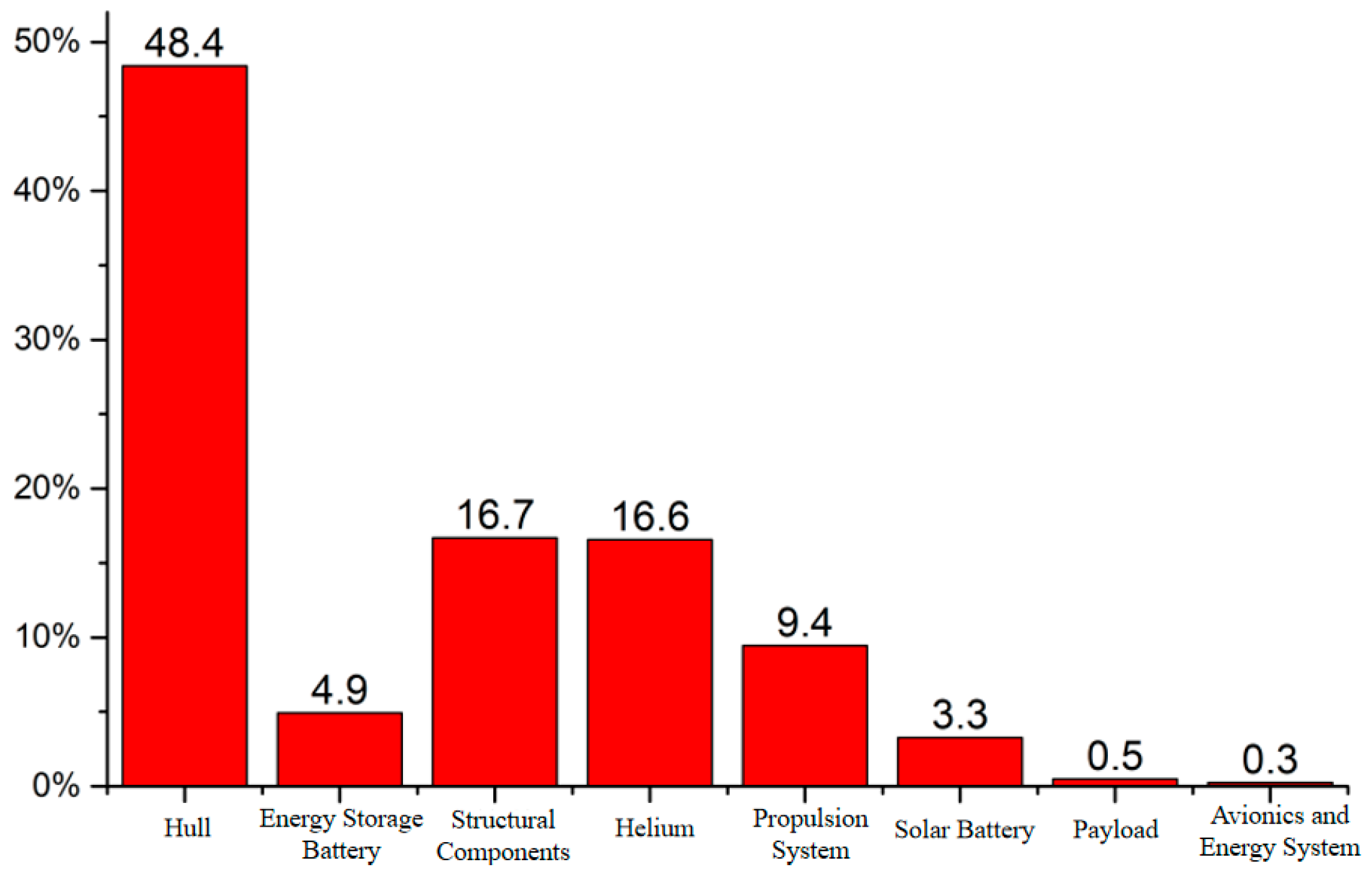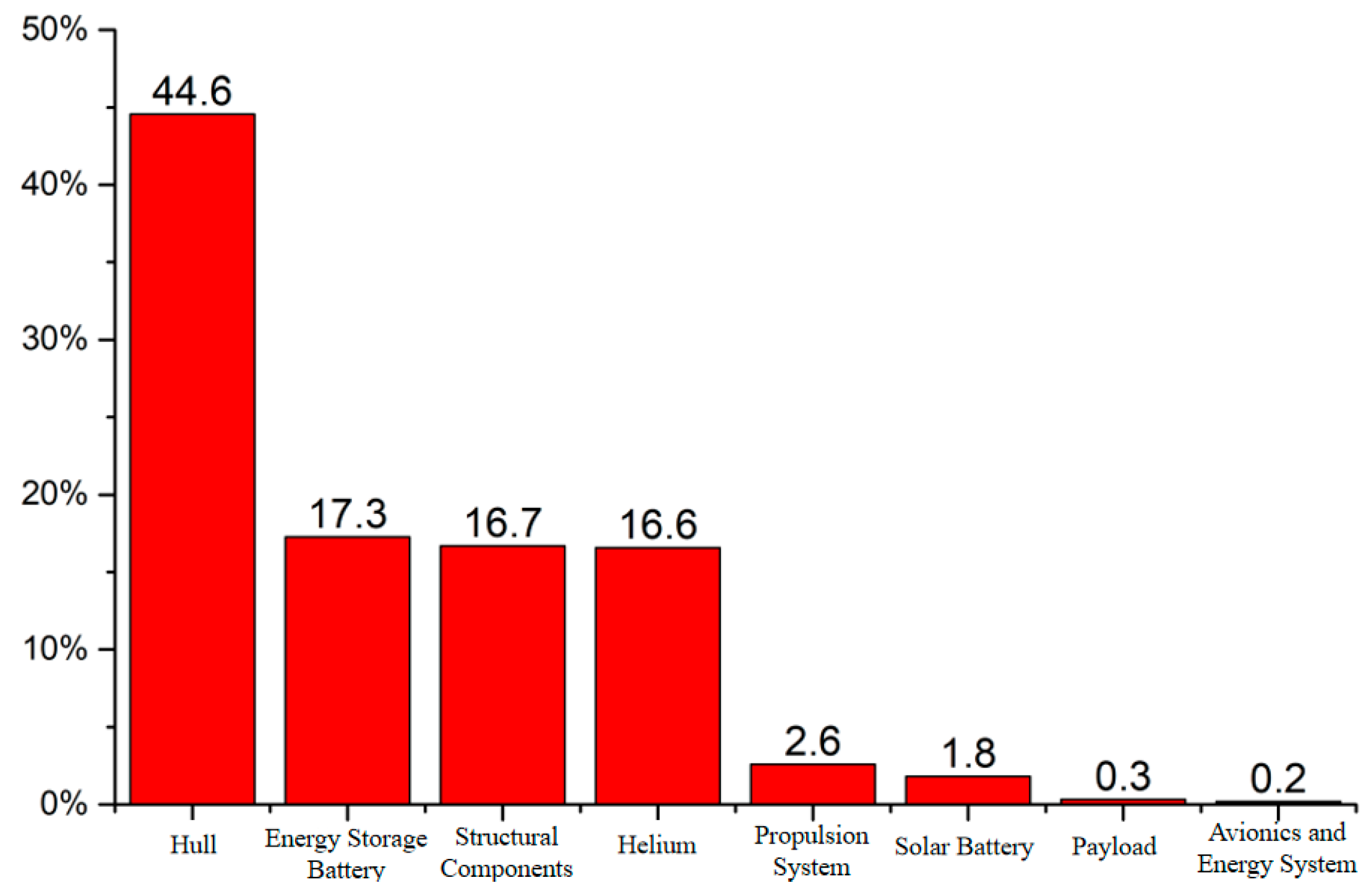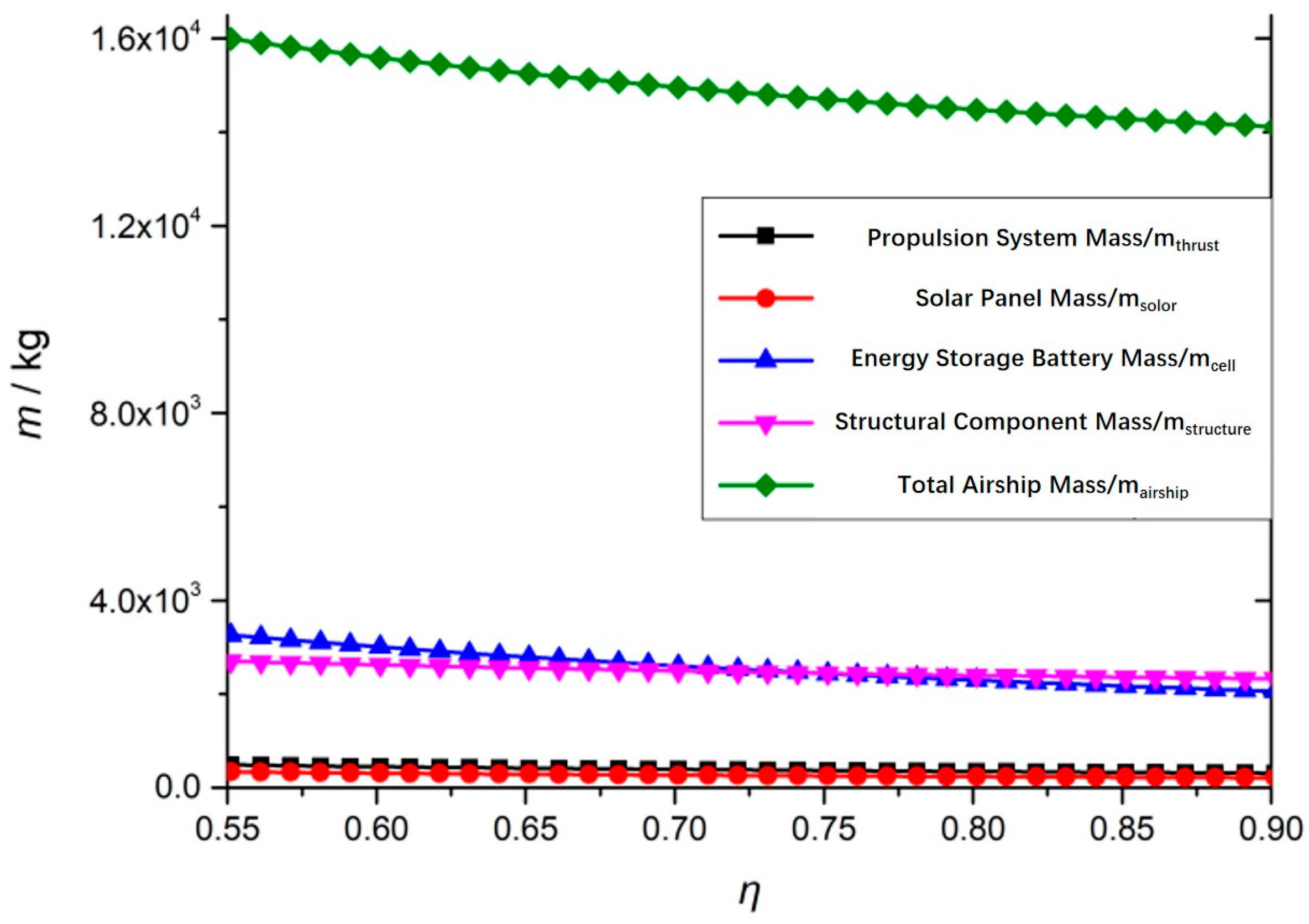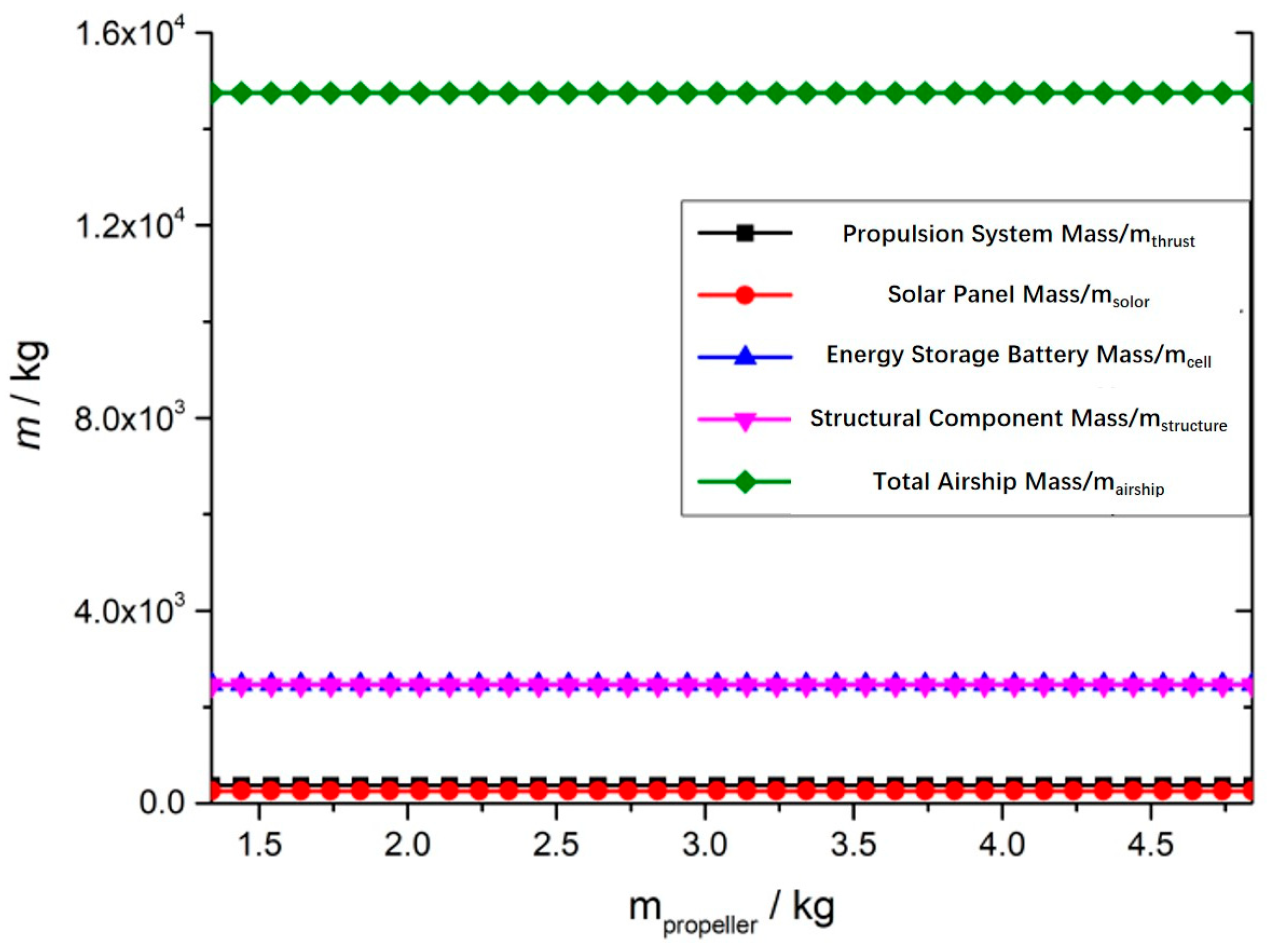 - In the daytime-optimized scheme, although both daytime and nighttime propeller efficiencies are lower than those achieved by the constant speed design, the total airship mass still decreased by 28.0%. In the nighttime-optimized scheme, the propeller efficiencies during both day and night improved compared to the daytime-optimized scheme, resulting in a 29.6% decrease in the airship’s total mass.