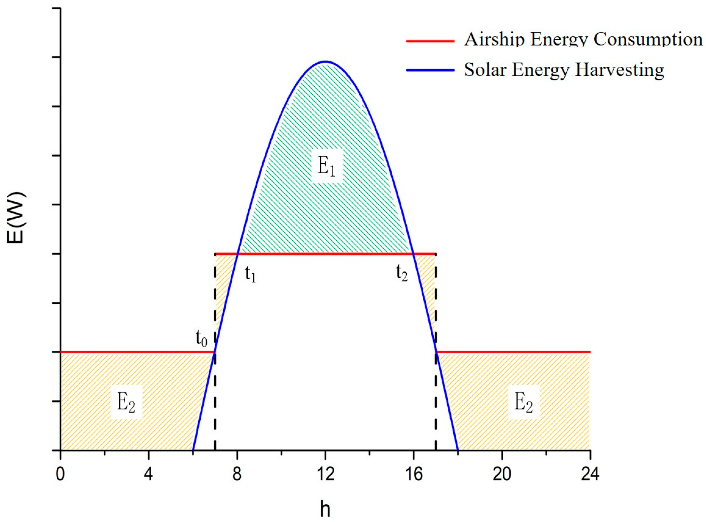 - A differentiated daytime–nighttime flight speed is introduced to significantly reduce the nighttime energy demand, enabling up to a 29.6% reduction in total airship mass.
