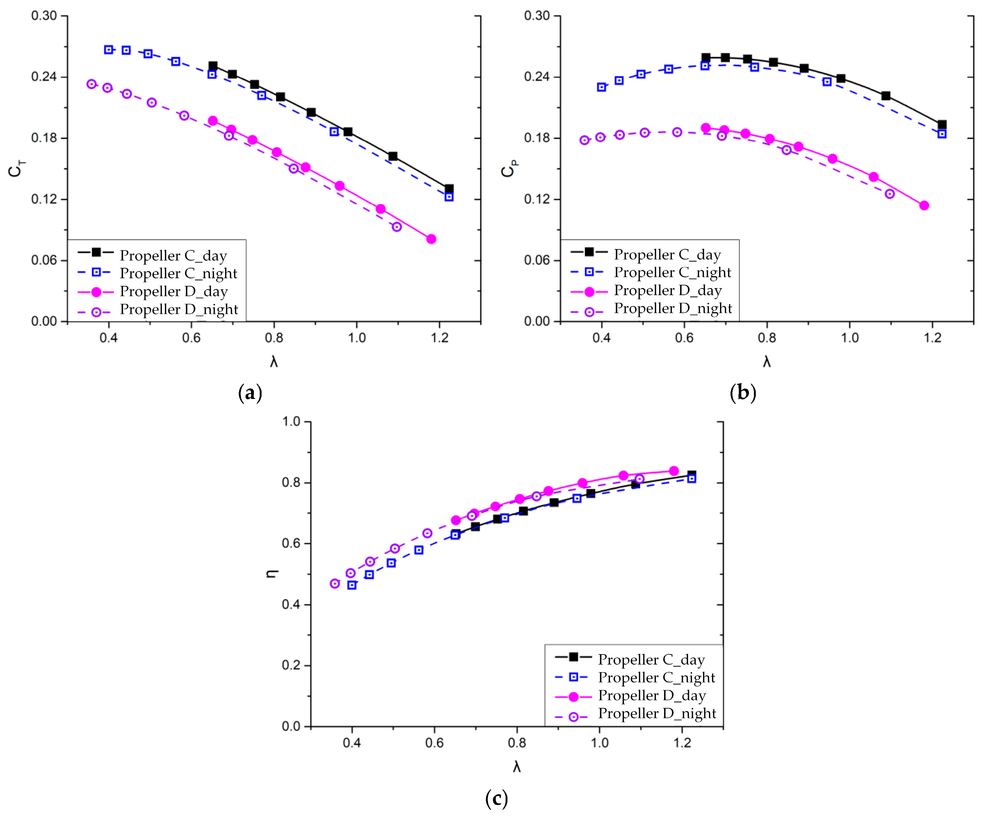 5.2. Comparison of Propeller Design Results Obtained by Maximizing Daytime and Nighttime Propeller Efficiency