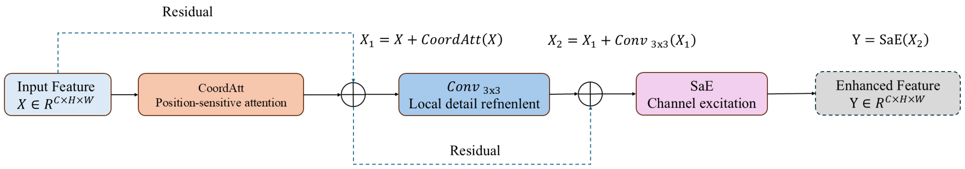 Structure of the proposed ConvSwinMerge module. Given an input feature map , the module first applies CoordAtt to inject position-sensitive attention and uses a residual connection to obtain . Then a convolution is employed for local detail refinement with another residual path, yielding . Finally, SaE performs channel excitation to produce the enhanced feature , where . Note that ConvSwinMerge is Swin-inspired in motivation but uses Coordinate Attention instead of shifted-window self-attention for efficiency.