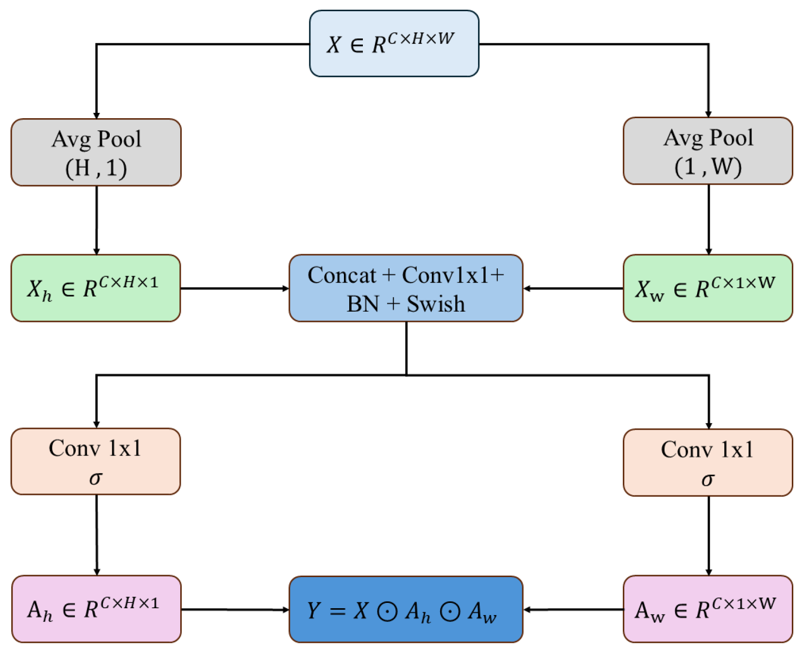 Architecture of the CoordAtt block used in ConvSwinMerge. Given an input feature map , average pooling is performed along the width and height directions to obtain and , respectively. The two descriptors are concatenated and transformed by a convolution followed by BN and Swish. Two parallel convolutions with sigmoid activation generate the direction-aware attention maps and . The output is obtained by reweighting the input feature as , where ⊙ denotes element-wise multiplication.