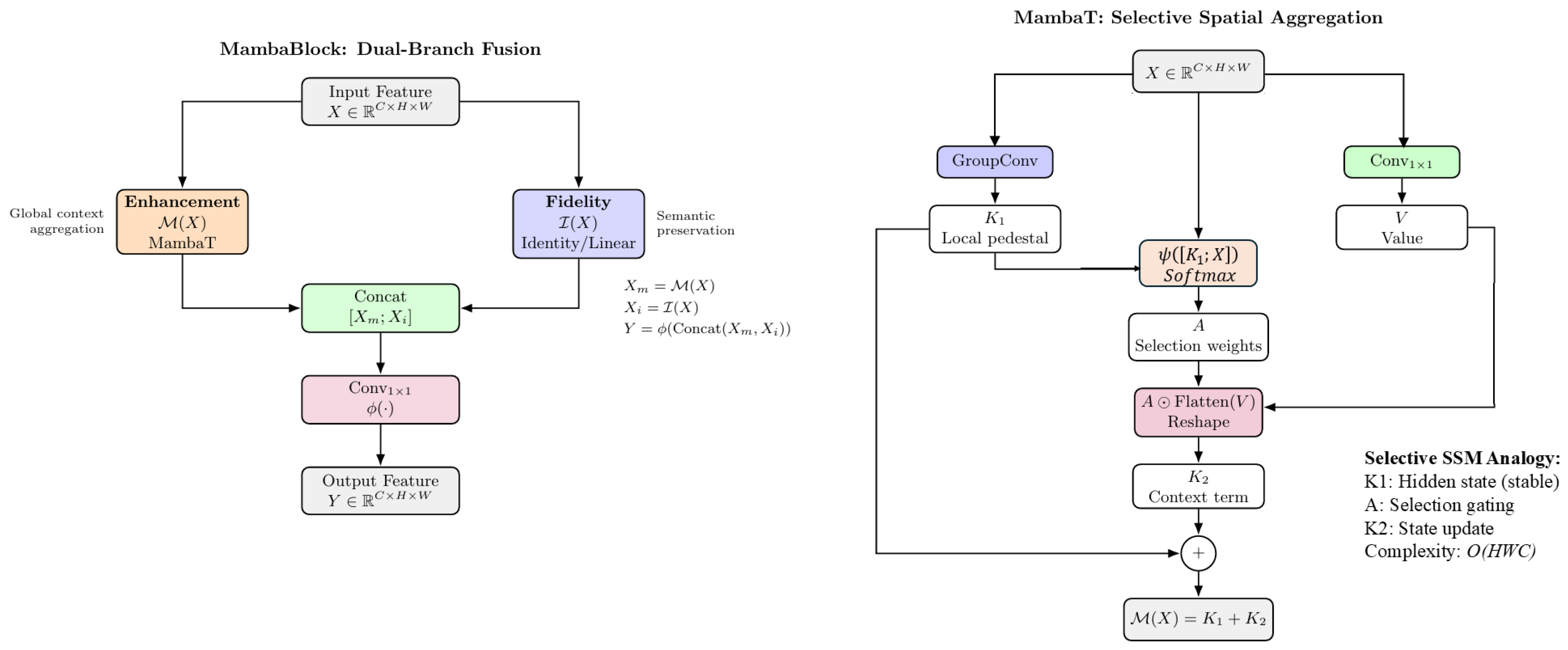 Left): MambaBlock adopts a dual-branch fusion strategy, where the enhancement branch