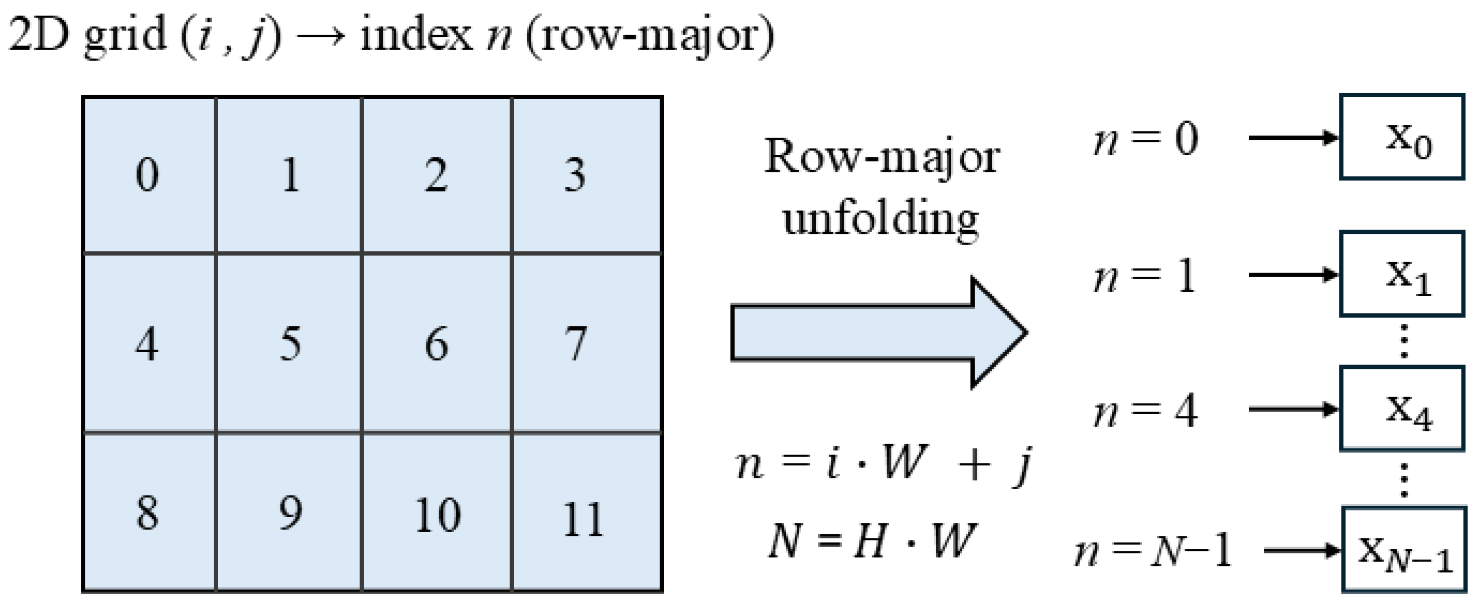 Row-major 2D-to-1D mapping before MambaT. The spatial grid is serialized into a 1D token sequence in row-major order. Each spatial location is mapped to the sequence index , producing tokens that are fed into the MambaT operator.