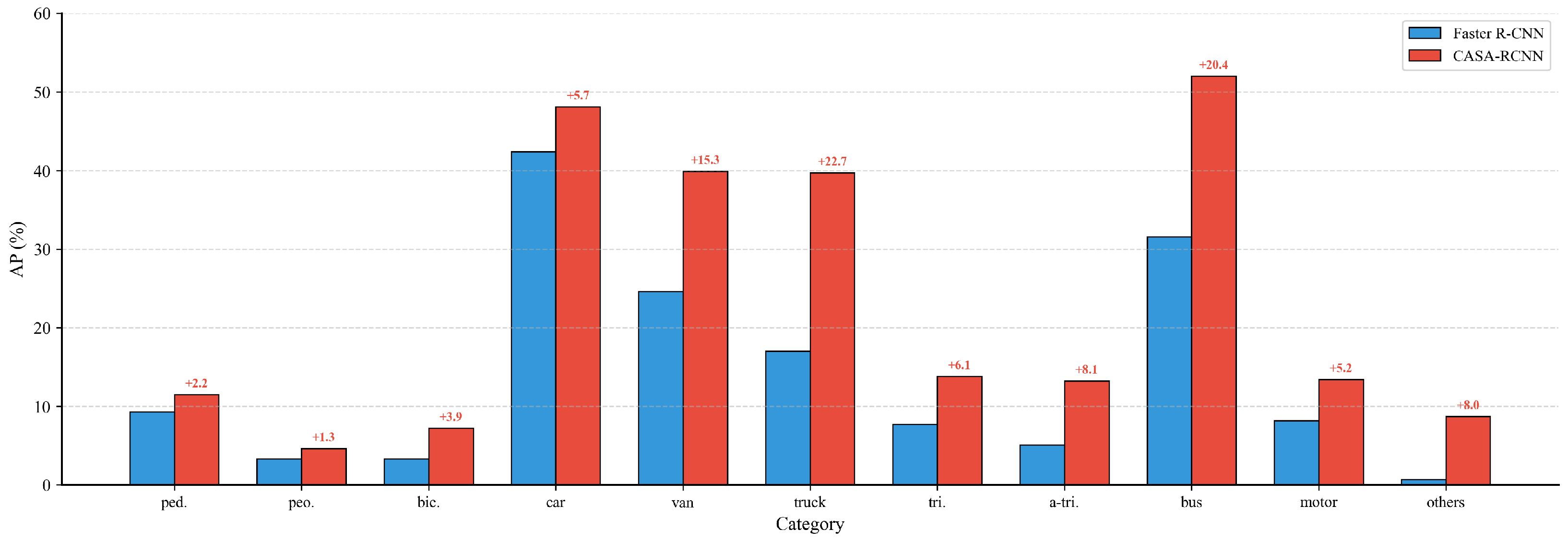 Per-category AP comparison between Faster R-CNN (baseline) and CASA-RCNN. The values above bars indicate the absolute improvement. CASA-RCNN yields consistent gains across all 11 categories, with particularly substantial improvements on truck (+22.7%), bus (+20.4%), and van (+15.3%), demonstrating enhanced discriminability for medium and large vehicle categories under complex backgrounds.