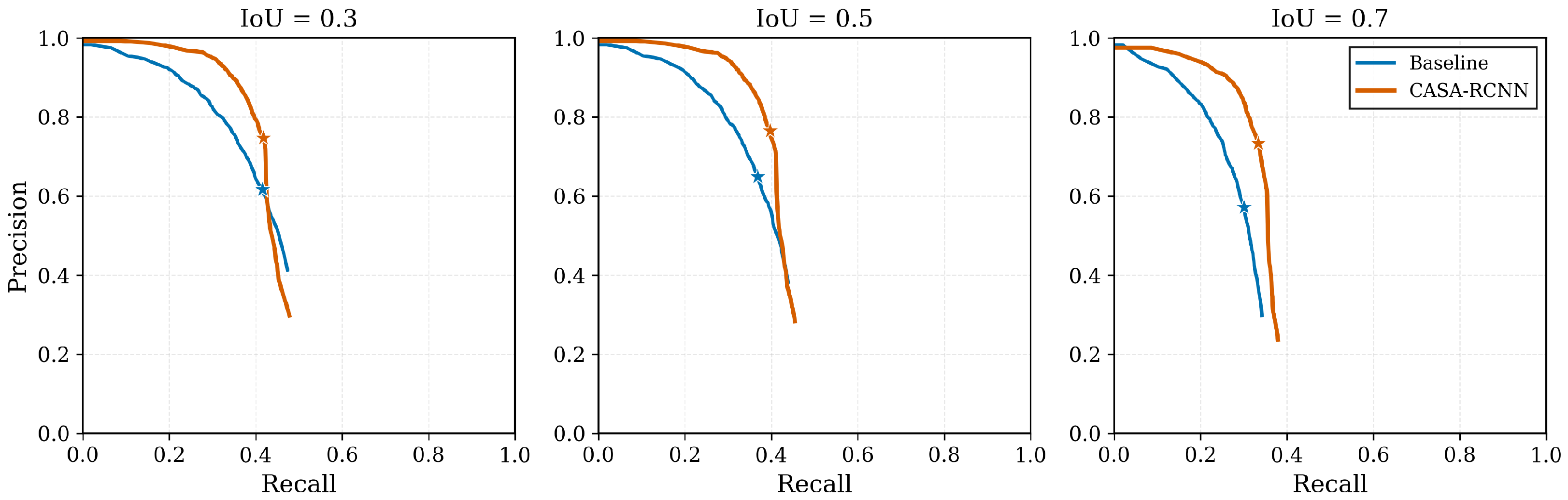 Precision–recall (PR) curves on VisDrone2021-DET under three IoU thresholds (0.3/0.5/0.7). The star denotes the operating point that maximizes the F1 score for each method. CASA-RCNN consistently yields a higher PR envelope than the baseline across all IoU settings, indicating superior detection quality under both loose and strict matching criteria. Note that the absolute recall saturates at a relatively low level (around 0.45), which is typical for VisDrone due to the prevalence of extremely small objects (e.g., < pixels), heavy crowding/occlusion, and class imbalance.