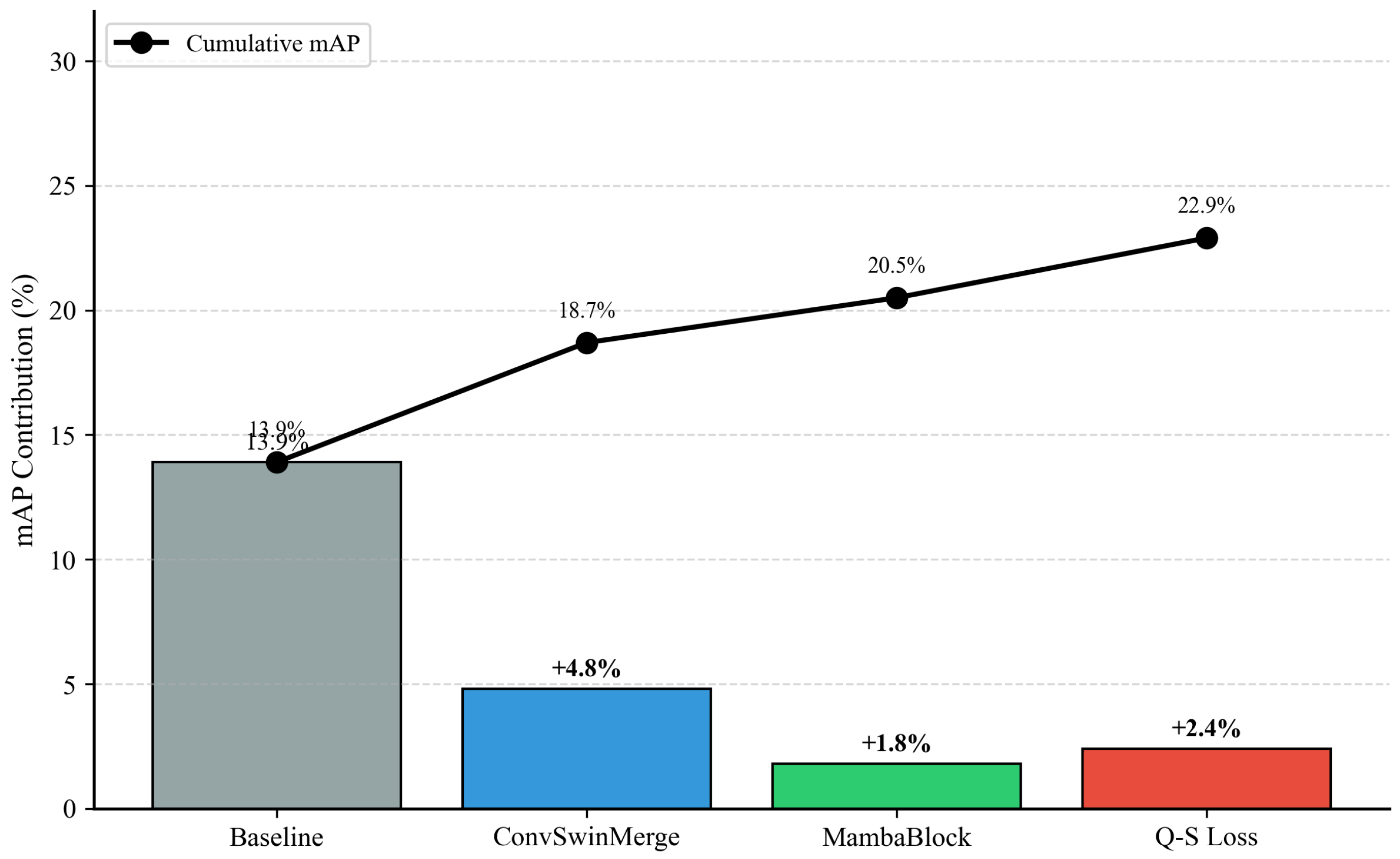 Cumulative contribution of each proposed component to detection performance. Starting from the Faster R-CNN baseline (13.9% mAP), ConvSwinMerge contributes +4.8%, MambaBlock adds +1.8%, and the quality–scale collaborative loss (Q–S Loss) further improves by +2.4%, yielding a total gain of +9.0% mAP.