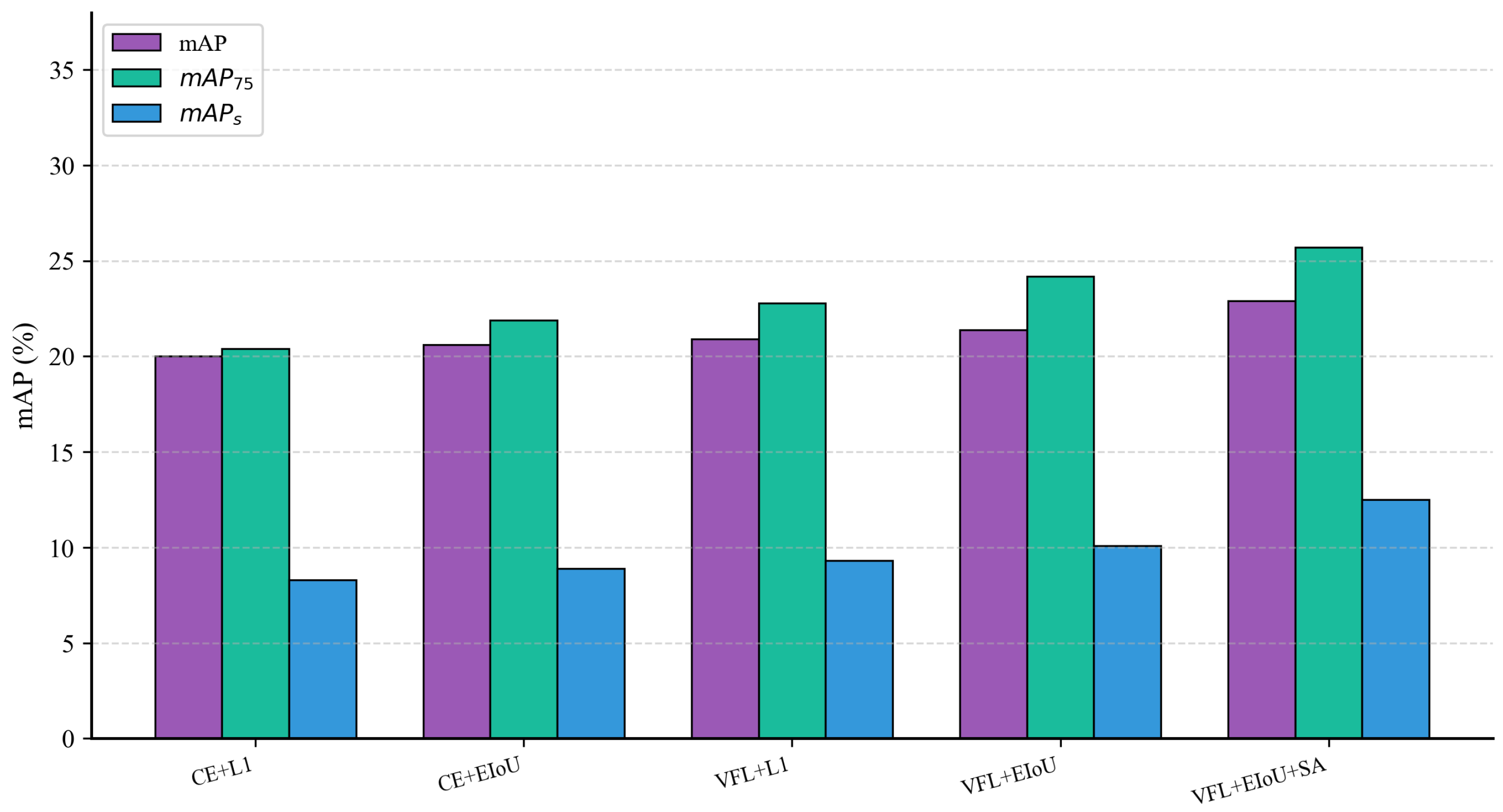 Ablation study on loss function combinations (on top of ConvSwinMerge + MambaBlock). CE: CrossEntropy loss; VFL: Varifocal Loss; EIoU: EIoU regression loss; SA: ScaleAdaptiveLoss. Replacing CrossEntropy with Varifocal Loss improves the alignment between classification confidence and localization quality. Combining with EIoU further enhances high-precision localization (: 20.4%→24.2%). The proposed ScaleAdaptiveLoss yields the most substantial gain on small objects (: 10.1%→12.5%, +2.4%), leading to the best overall performance (22.9% mAP).