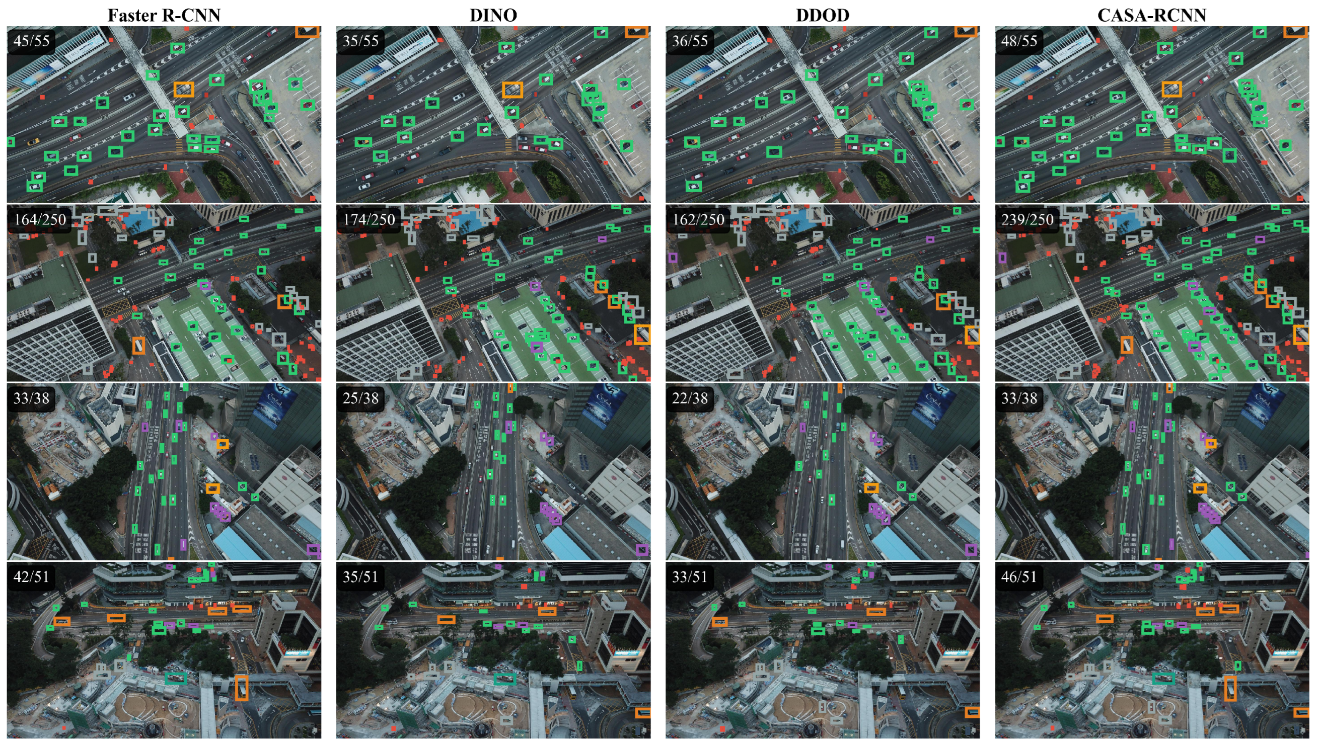 Qualitative. The different color boxes here represent the different results detected comparison of detection results across different methods. Each column represents a detection algorithm (Faster R-CNN, DINO, DDOD, CASA-RCNN from left to right), and each row shows a different aerial scenario. The numbers in the top-left corner indicate detected/total objects. CASA-RCNN consistently achieves the highest detection rates across all scenarios, demonstrating superior performance in detecting small and densely distributed objects.