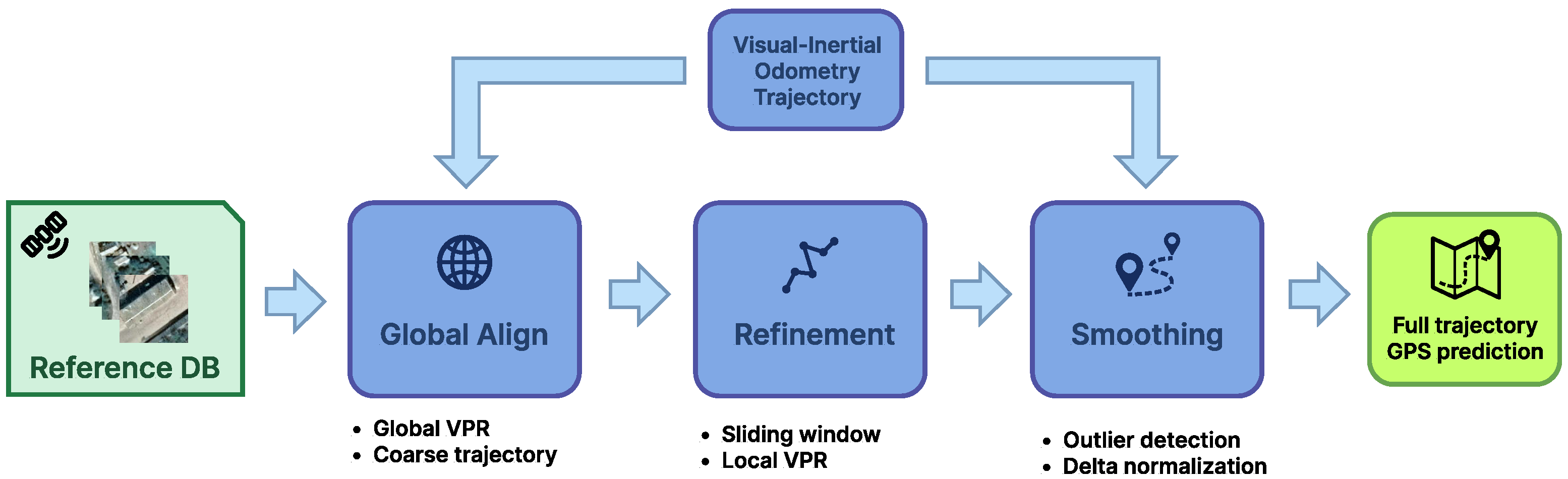 on top of any VIO system, using its relative motion output as a prior while correcting global drift via satellite imagery matching.