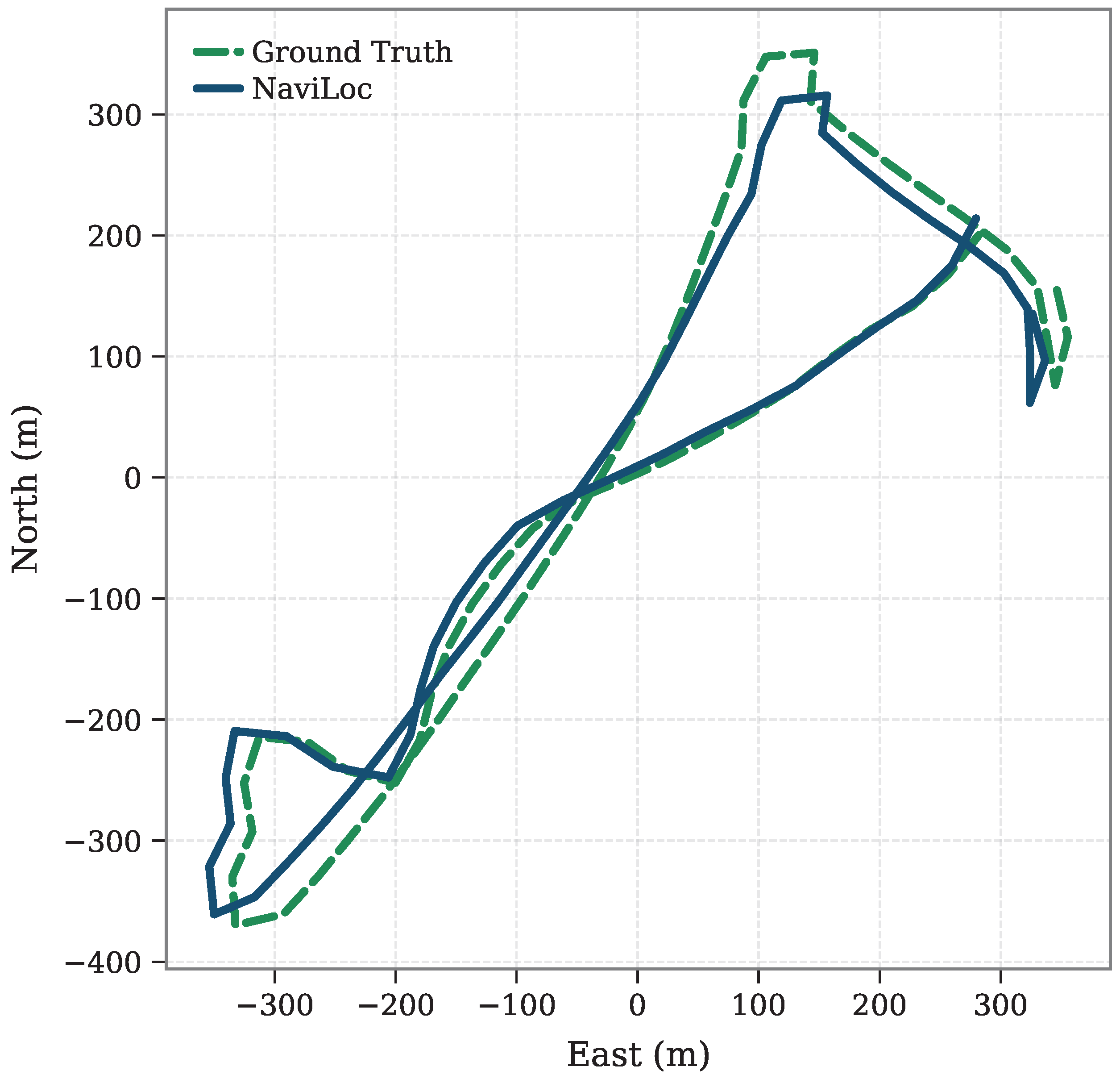 relative motion estimation but accumulate unbounded drift over long trajectories. These methods solve a fundamentally different problem than NaviLoc: VIO estimates how the platform moved (relative poses), while NaviLoc estimates where the platform is in the world (global positions). NaviLoc is designed to operate