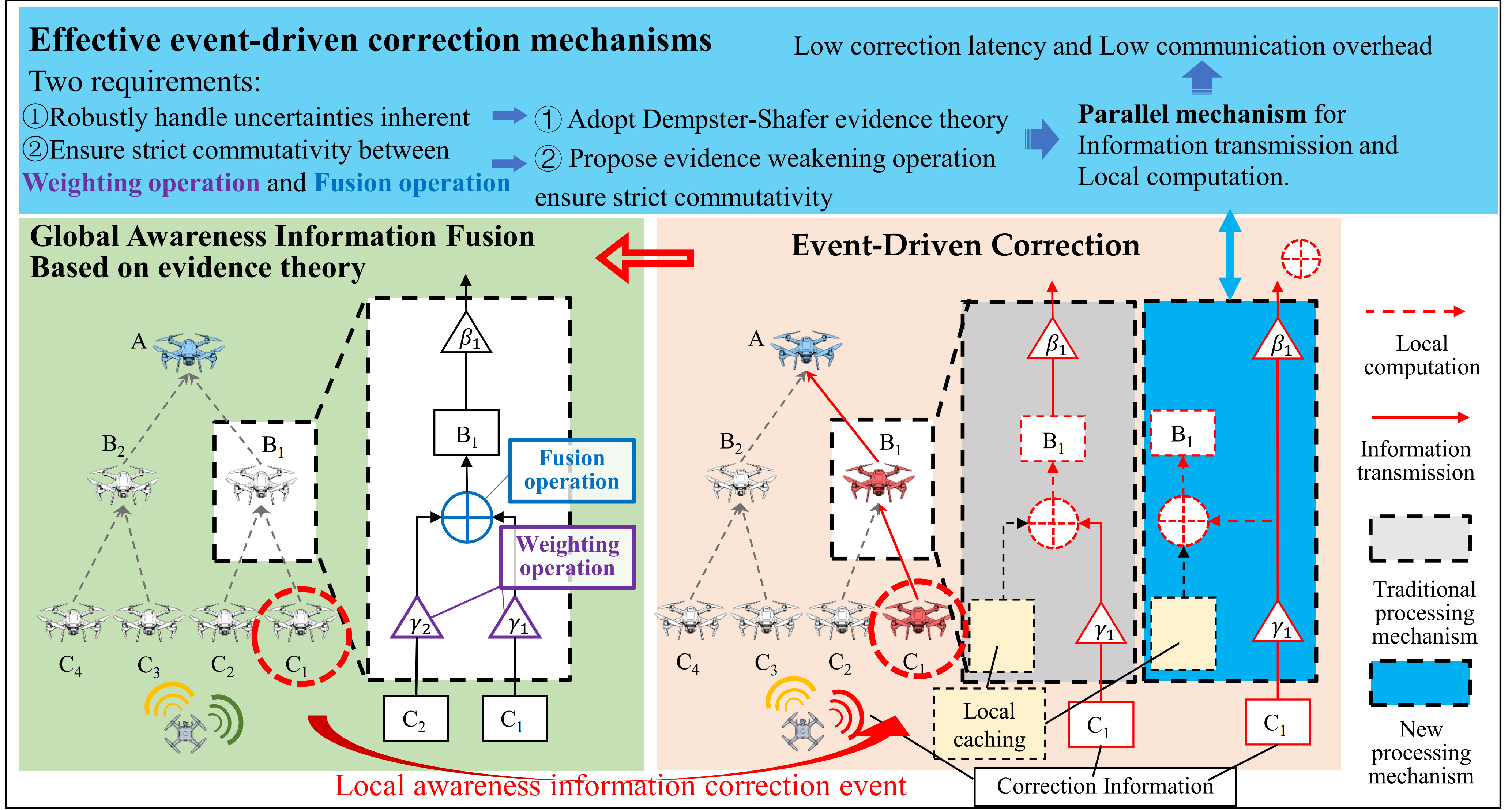 5]. This perceptual process is inherently a collective effort, where each unit gathers local data through onboard sensors, and a shared understanding is formed through collaborative information fusion. However, sudden environmental changes or adversarial interventions may trigger local evidence that contradicts the global consensus, necessitating an event-driven correction mechanism to achieve rapid cognitive convergence.