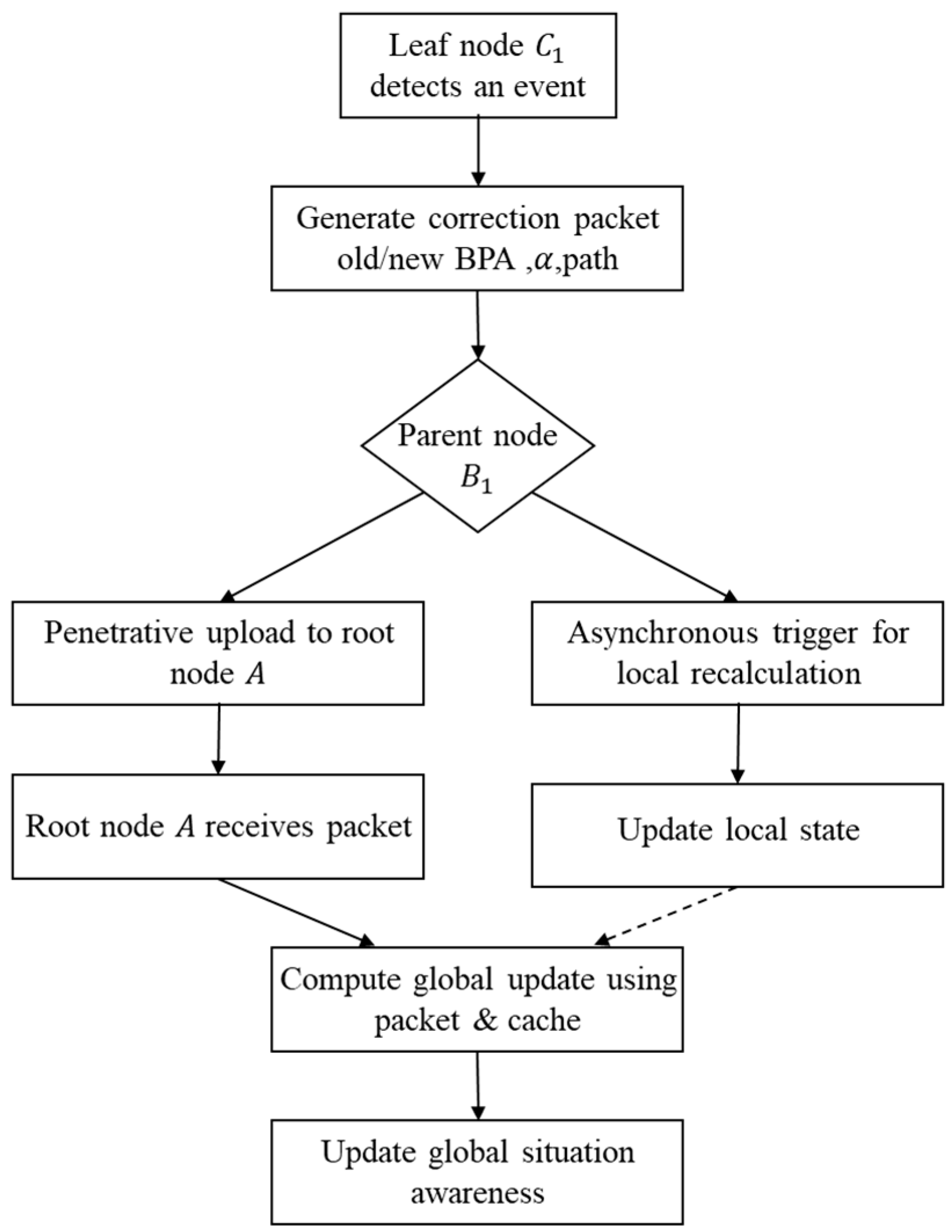 Protocol design: Leveraging this commutativity, we design a practical, event-driven correction protocol for hierarchical UAV swarms. Its core innovation is the decoupling of penetrative update propagation from local asynchronous recomputation, enabling low-latency global corrections without centralized coordination or global re-fusion.