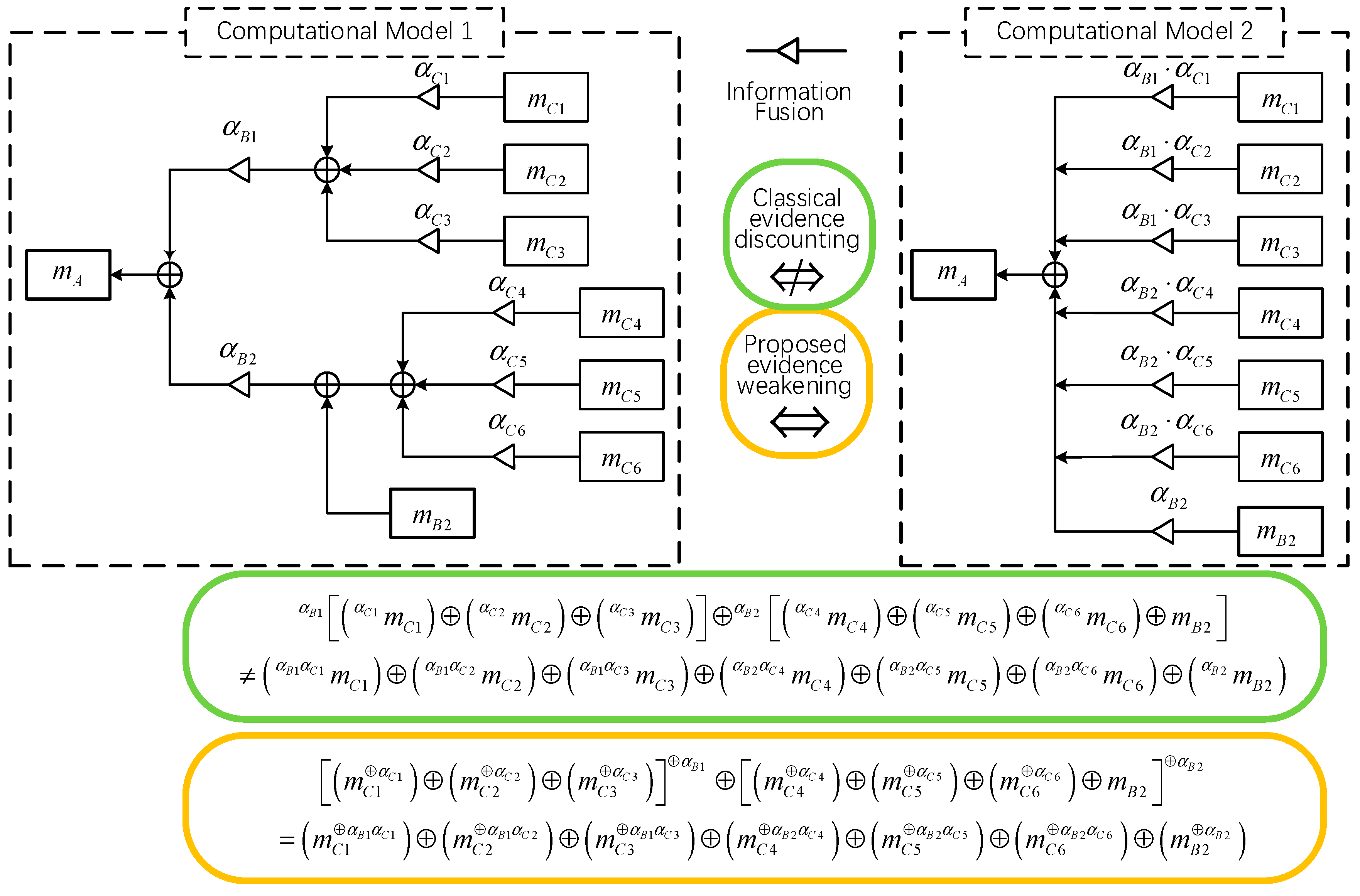 30] has proposed various enhanced discounting models. Nevertheless, most remain grounded in the conceptual framework of traditional discounting and fail to fundamentally resolve the commutativity issue. This persistent shortcoming serves as the direct motivation for introducing the evidence weakening operation in