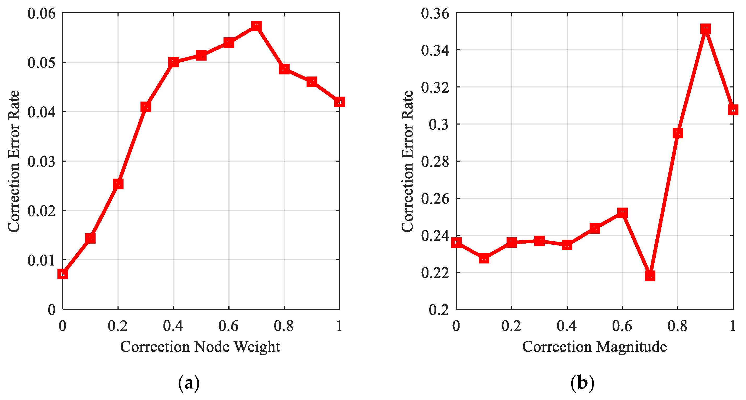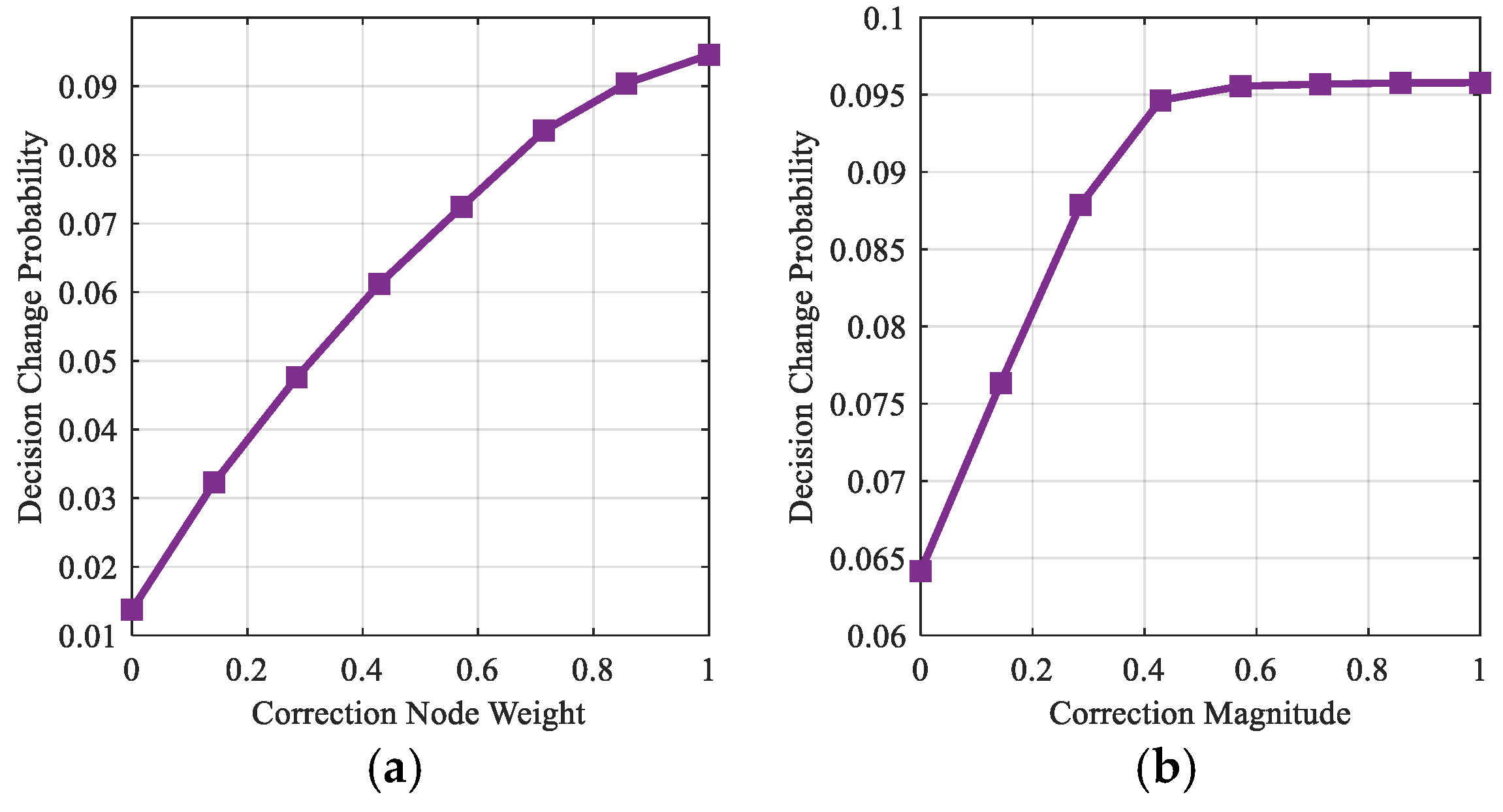 Impact of correction parameters on decision change rate. (a) Correction node weight; (b) correction magnitude.