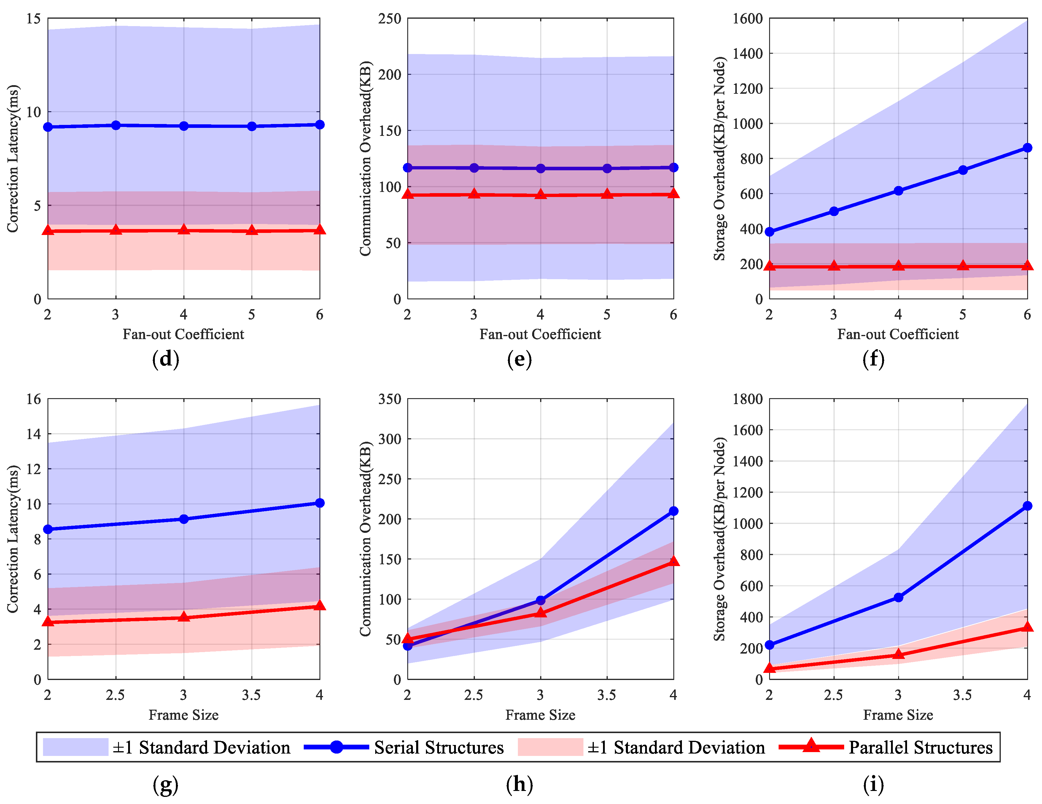 Effect of network depth, fan-out coefficient, and frame size on performance metrics. (a–c) vs. network depth; (d–f) vs. Fan-out coefficient; (g–i) vs. frame size.