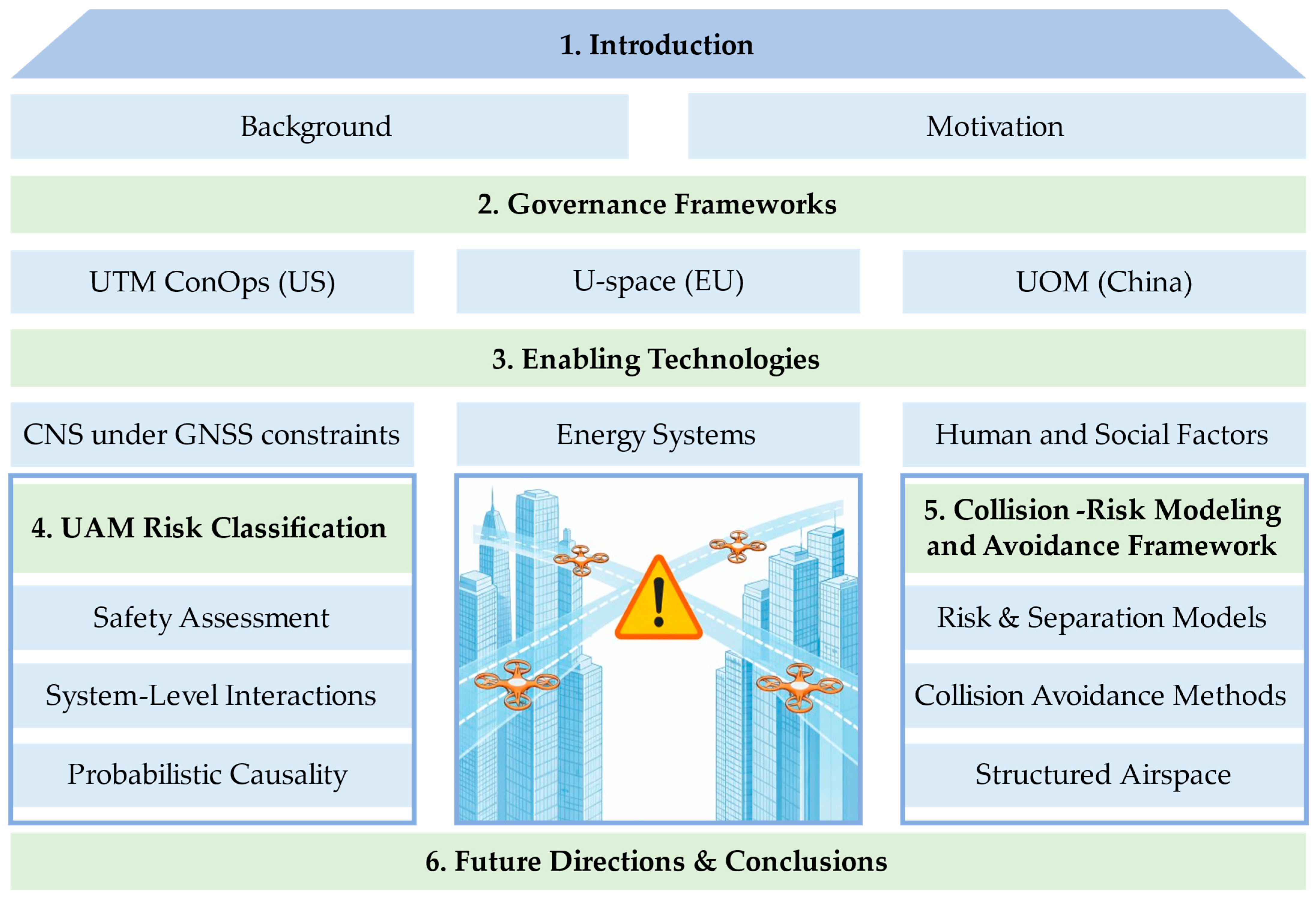 This review is therefore aimed at providing a comprehensive and structured synthesis of international research progress regarding mid-air collision risk and its mitigation for UAM. The main objectives are threefold: