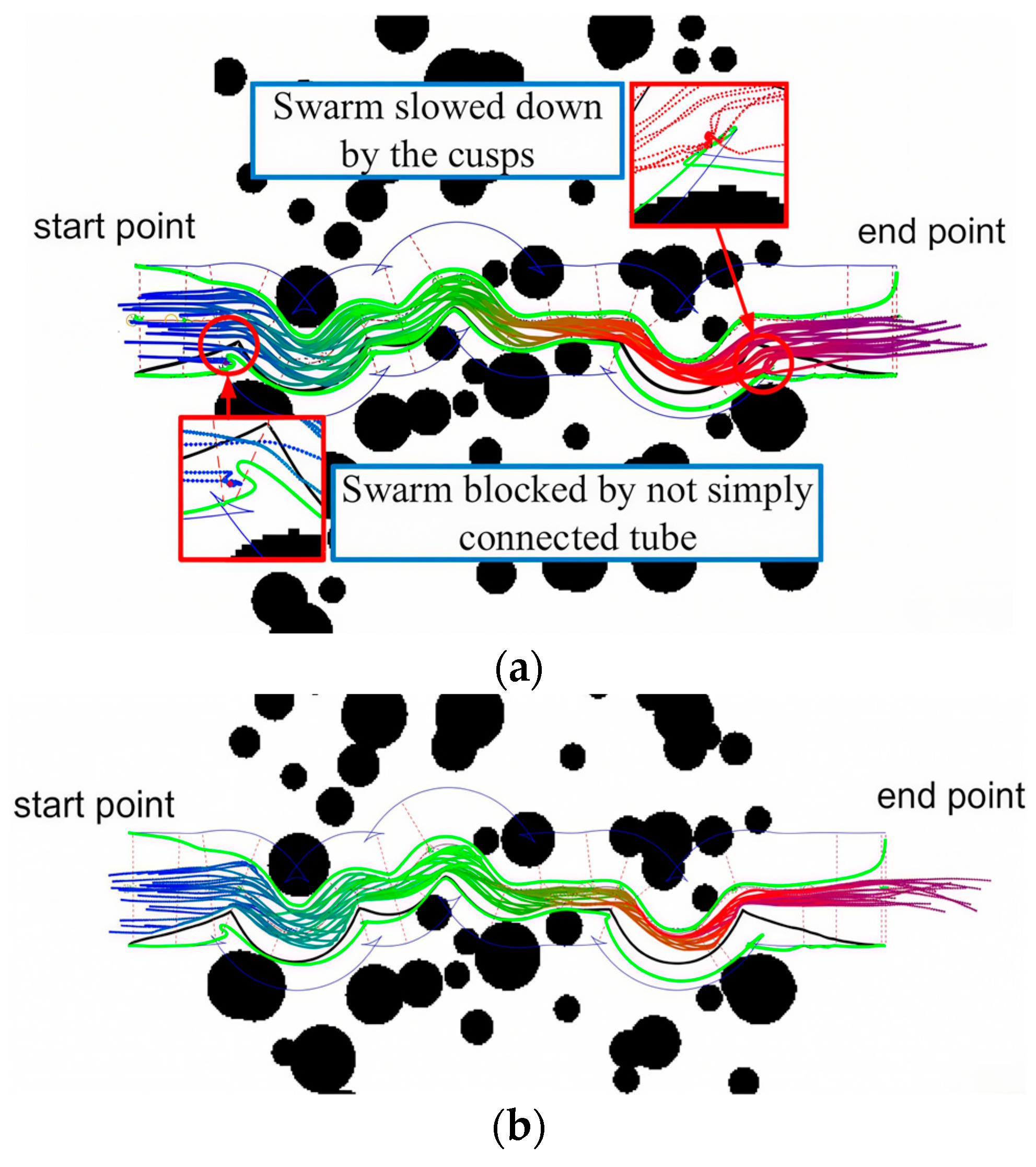 Table 13. Comparison of the virtual tubes in the obstacle-dense environment [146]. (Tr: run time (s), Dd: minimum distance between drones (m), Ds: minimum distance from tube surface (m), Ar: arrival rate).