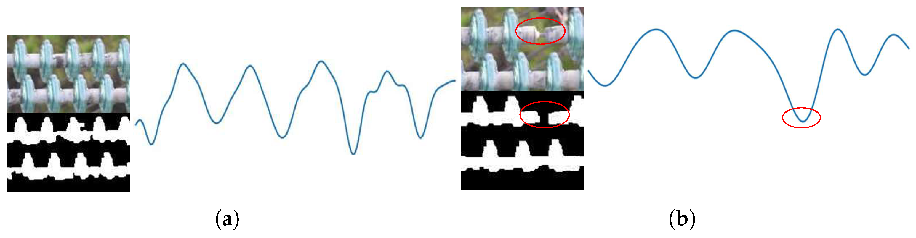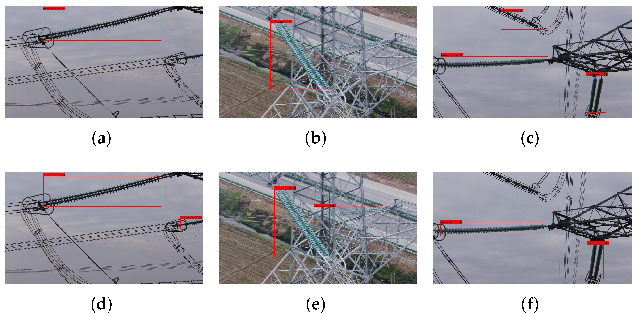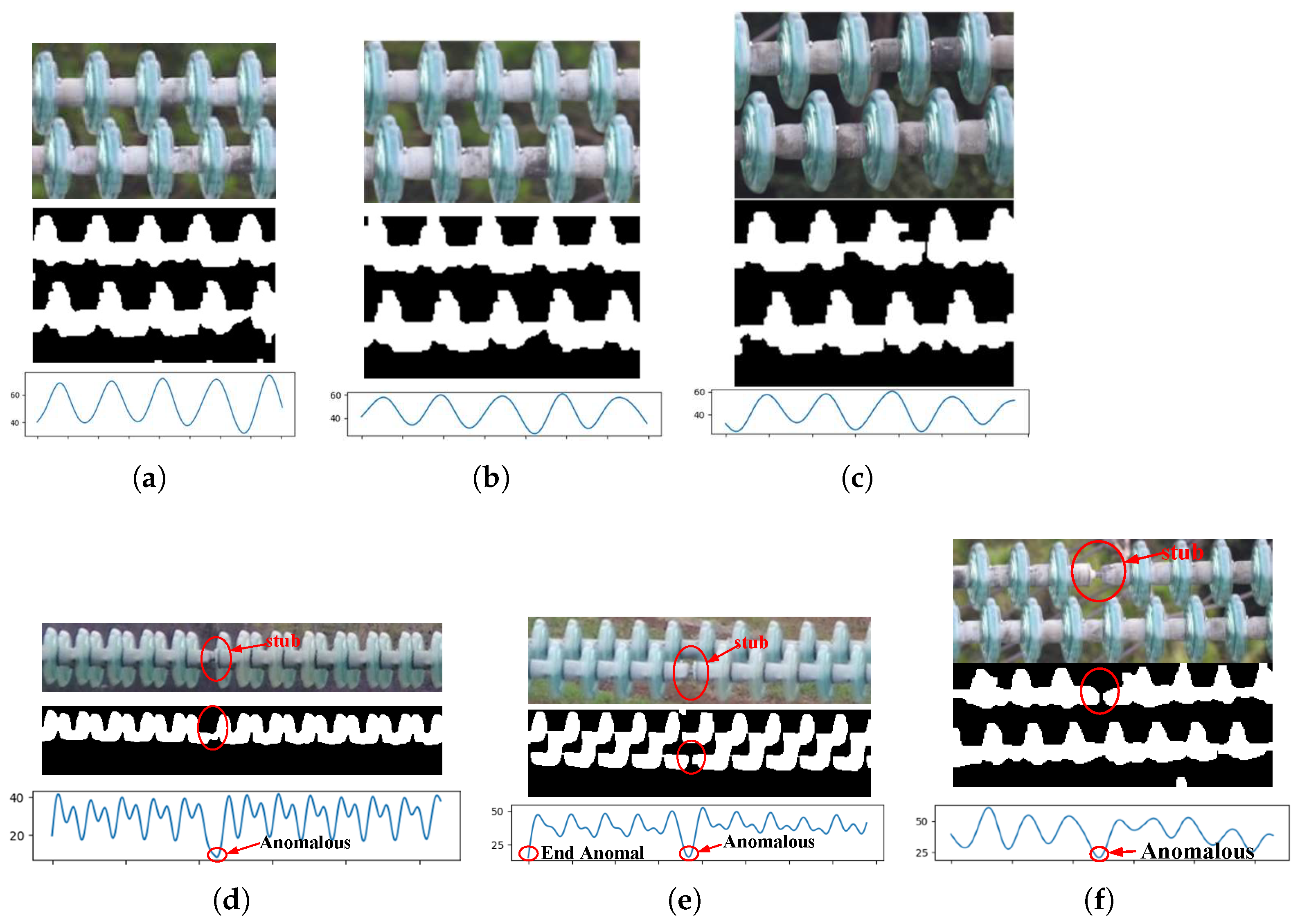 - Instead of directly treating missing defects as an independent detection class, the segmented insulator region is further processed by traditional image analysis to construct a defect curve for missing defect determination. This strategy reduces the dependence on large-scale missing defect samples and improves the practicality of the proposed method.
