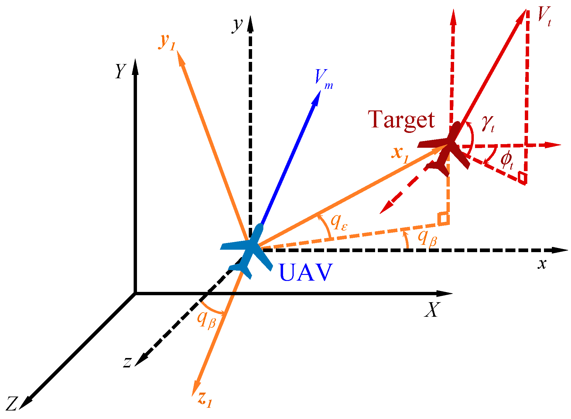 2]. This interception scenario is inherently a two-player pursuer–evader game, where the UAV pursuer aims to minimize the miss distance and satisfy terminal constraints, while the non-cooperative target acts as the evader, maximizing its maneuver uncertainty to evade interception [