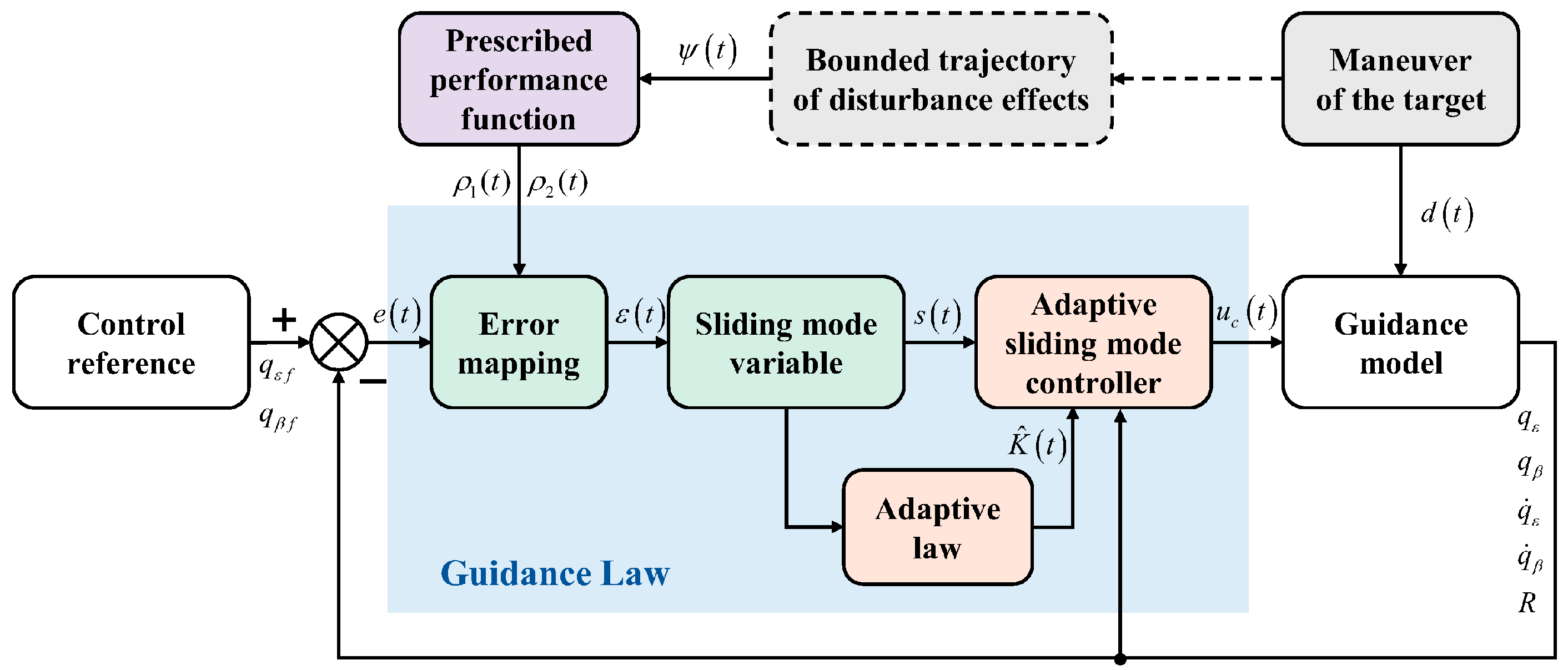 A sliding mode surface is synthesized from the transformed error, and a robust sliding mode controller is developed to fast drive the sliding mode variable to zero under uncertainty of the target. The robustness is achieved by a dedicated adaptive law, which continuously estimates the bound of the uncertainty and provides real-time compensation. The overall architecture, integrating these components, is illustrated in