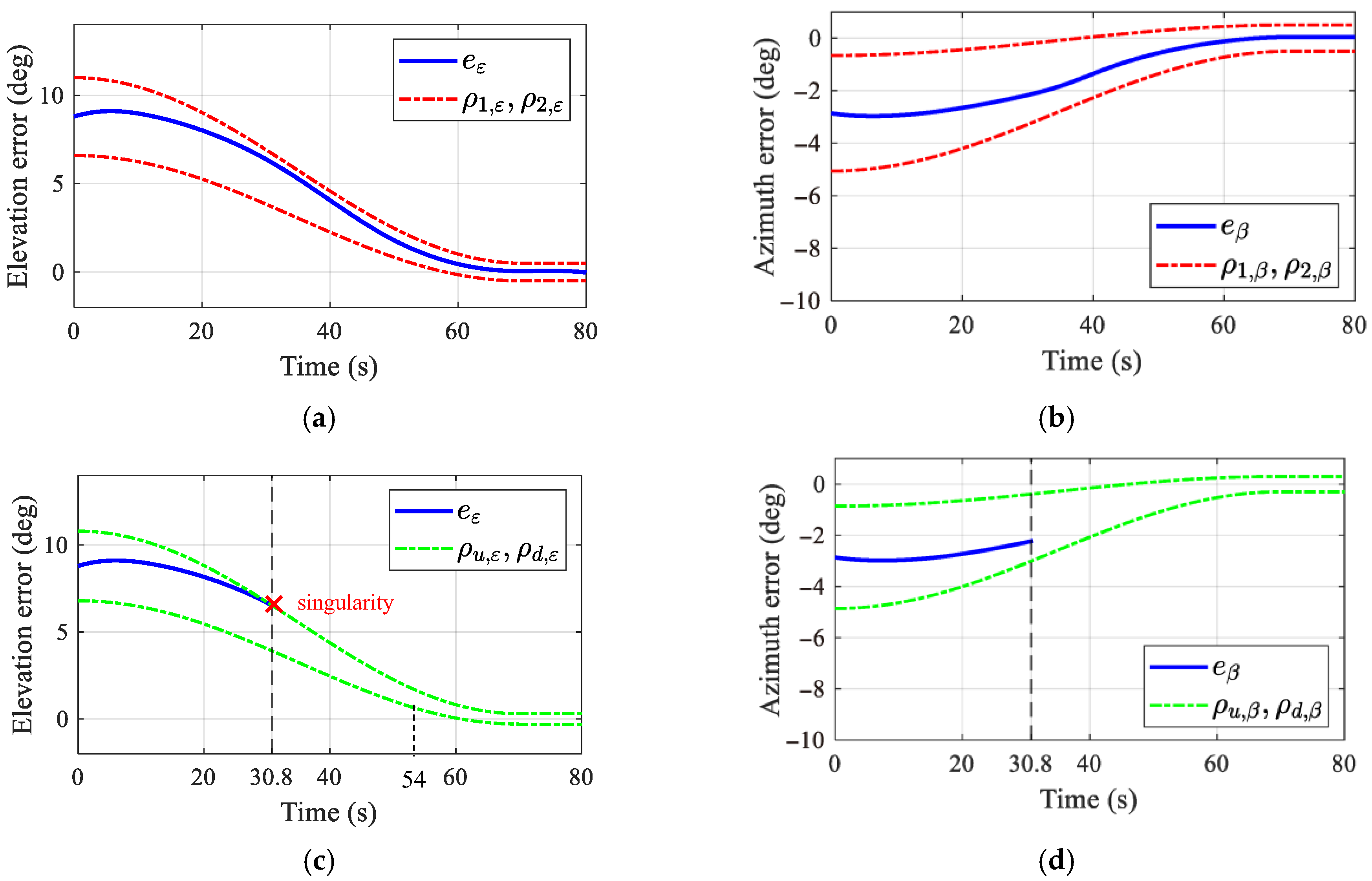 As can be observed, the modified performance boundaries effectively accommodate the error variations induced by target uncertainties, and the tracking errors in both the elevation and azimuth channels converge to within at the terminal time. In contrast, for the conventional PPC without boundary adjustment, the elevation error exceeds the upper bound of the prescribed performance function at approximately , triggering a control singularity and causing the simulation to terminate prematurely. These results clearly demonstrate that the proposed method alleviates the singularity issue inherent in conventional PPC under significant maneuver uncertainties.