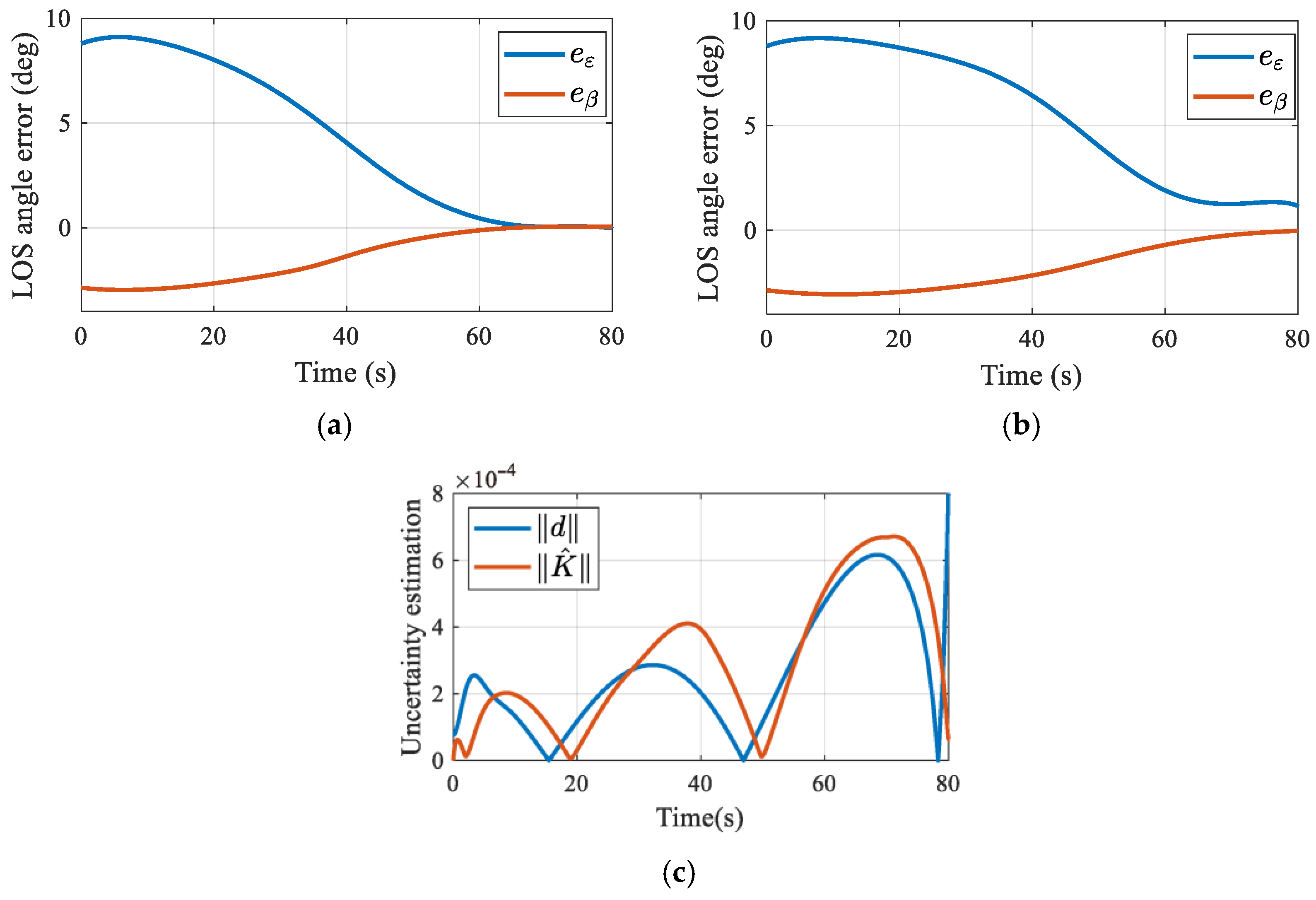Figure 8a,b exhibit a smooth and monotonic decrease, confirming that no undesirable oscillations or divergence occur during the engagement.