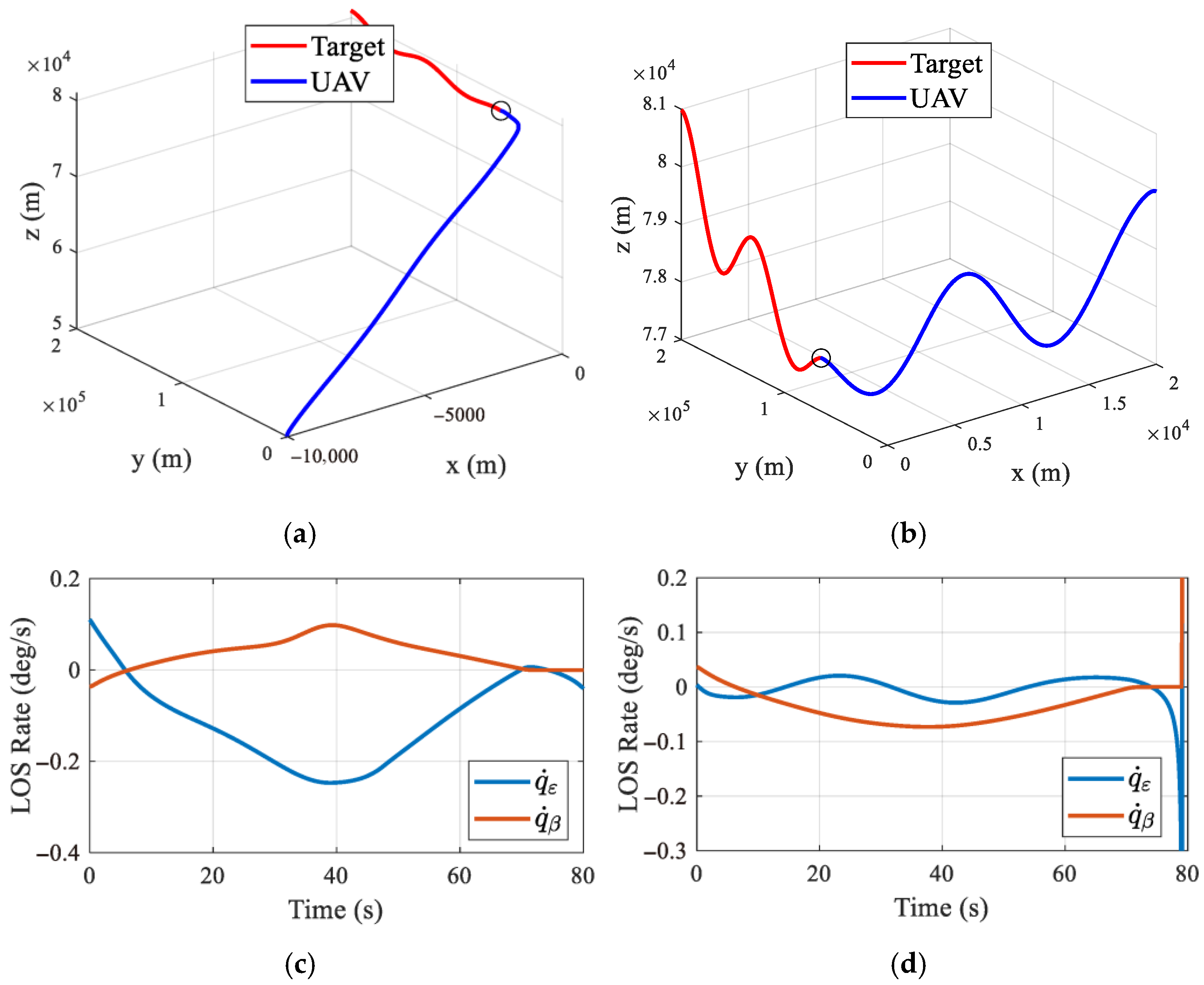 Figure 7a,b, despite the variations in initial geometry, the UAV successfully intercepts the target in all tested scenarios, demonstrating the versatility of the proposed method in three-dimensional pursuit missions. The LOS angular rates in