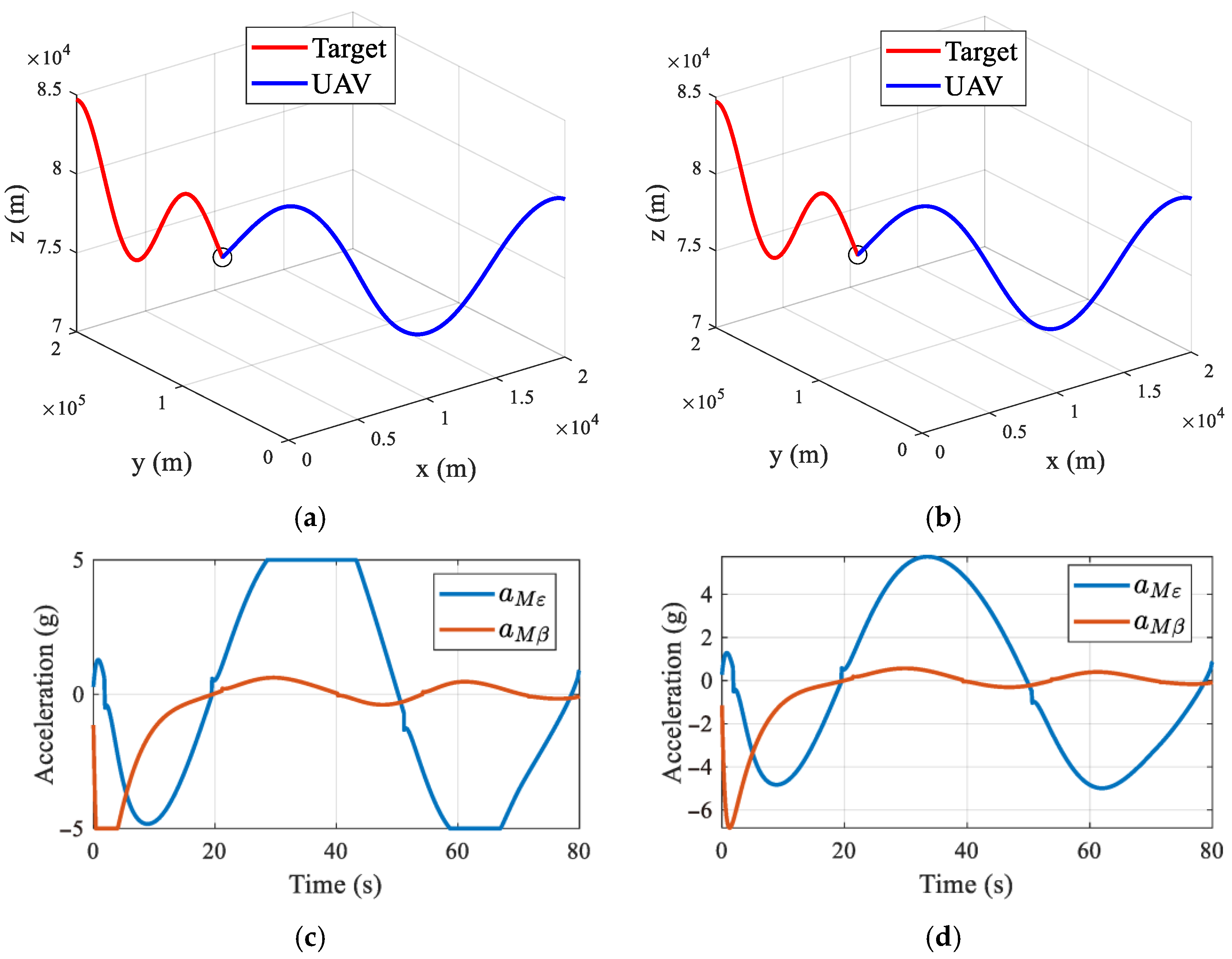 In this subsection, a more challenging scenario with strong target maneuvers is considered. Under such severe maneuver uncertainties, the UAV’s acceleration commands frequently reach saturation limits throughout most of the engagement. To evaluate the impact of actuator saturation on guidance performance, a comparative study is conducted between the proposed method with and without acceleration constraints. The simulation results are presented in