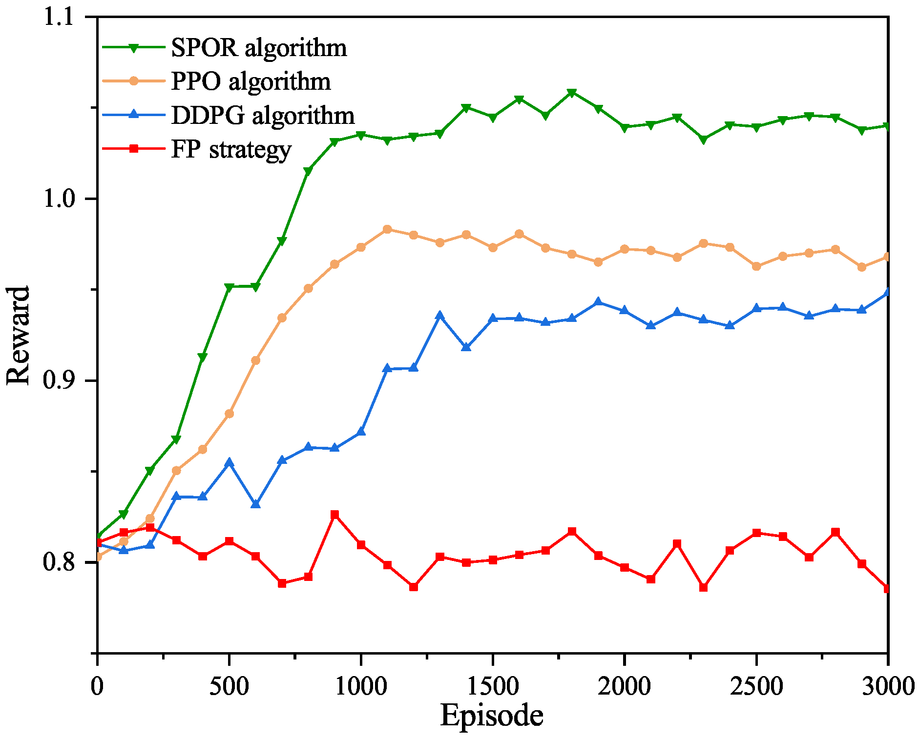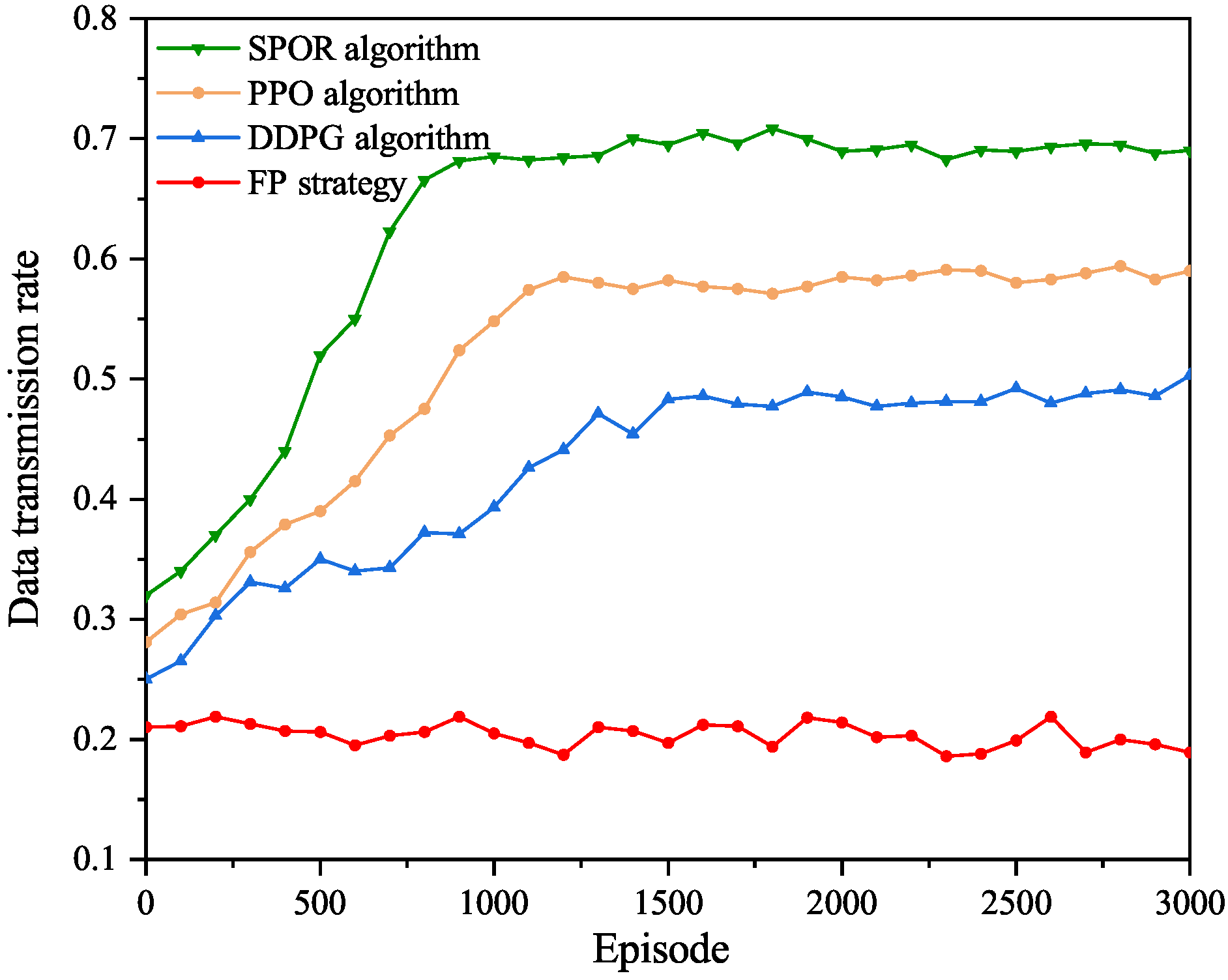 Figure 5 compares the data transmission rates achieved by four different algorithms. As shown in the figure, the proposed SPOR algorithm consistently outperforms the other approaches, converging to a stable data transmission rate of approximately 0.7 after around 1000 training episodes. The PPO algorithm achieves a lower stable rate of about 0.58, while the DDPG algorithm converges to approximately 0.47. The proposed algorithm achieves a data transmission rate improvement of over 48% compared with the DDPG baseline, and about 20% compared with PPO. In contrast, the FP strategy exhibits significantly inferior performance, with its data transmission rate remaining at a low level of around 0.2 throughout the training process. These results demonstrate the effectiveness of the proposed algorithm in improving data transmission performance.