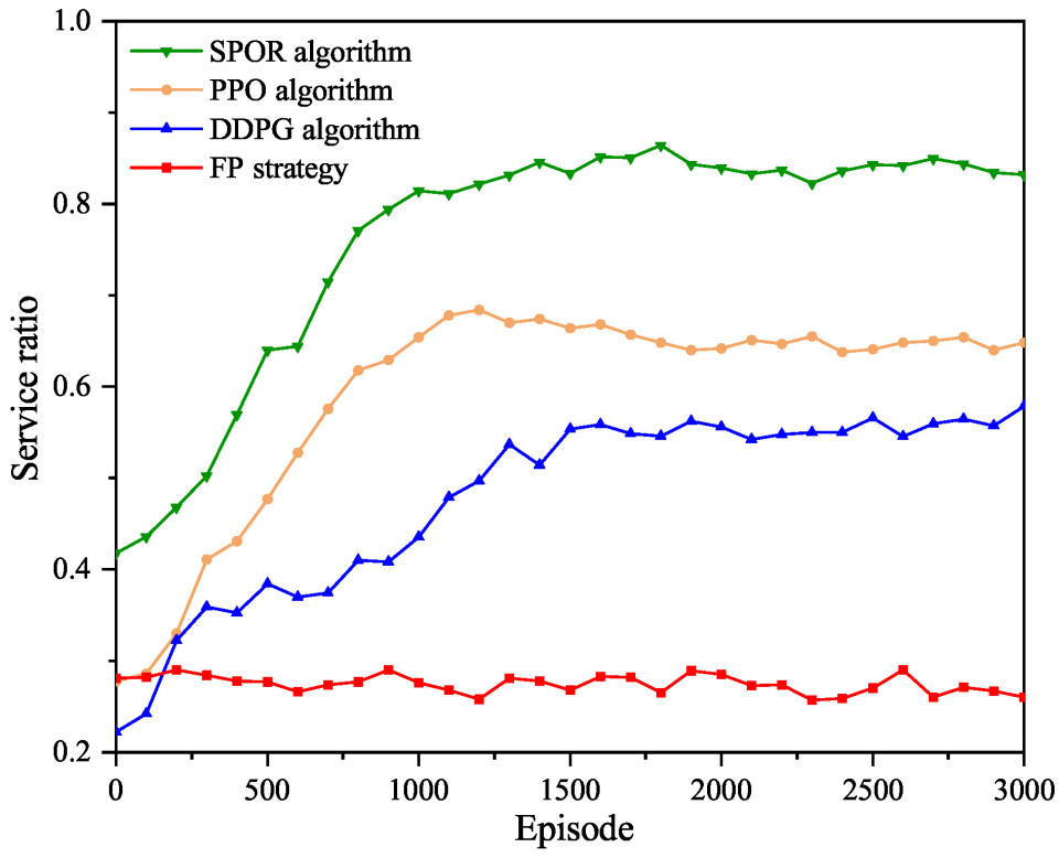 Figure 6 illustrates the evolution of the service ratio over training episodes under different algorithms. As shown in the figure, the proposed SPOR algorithm consistently achieves the highest service ratio and converges to a stable level of approximately 0.82 after approximately 1200 training episodes, demonstrating its effectiveness in resource allocation and task scheduling. The PPO algorithm stabilizes at a lower service ratio of about 0.64, while the DDPG algorithm converges to approximately 0.55. The proposed algorithm achieves a service ratio improvement of over 49% compared with the DDPG baseline, and about 28% compared with PPO. In contrast, the FP strategy exhibits significantly inferior performance, with its service ratio remaining at a low level of around 0.28 throughout the training process.