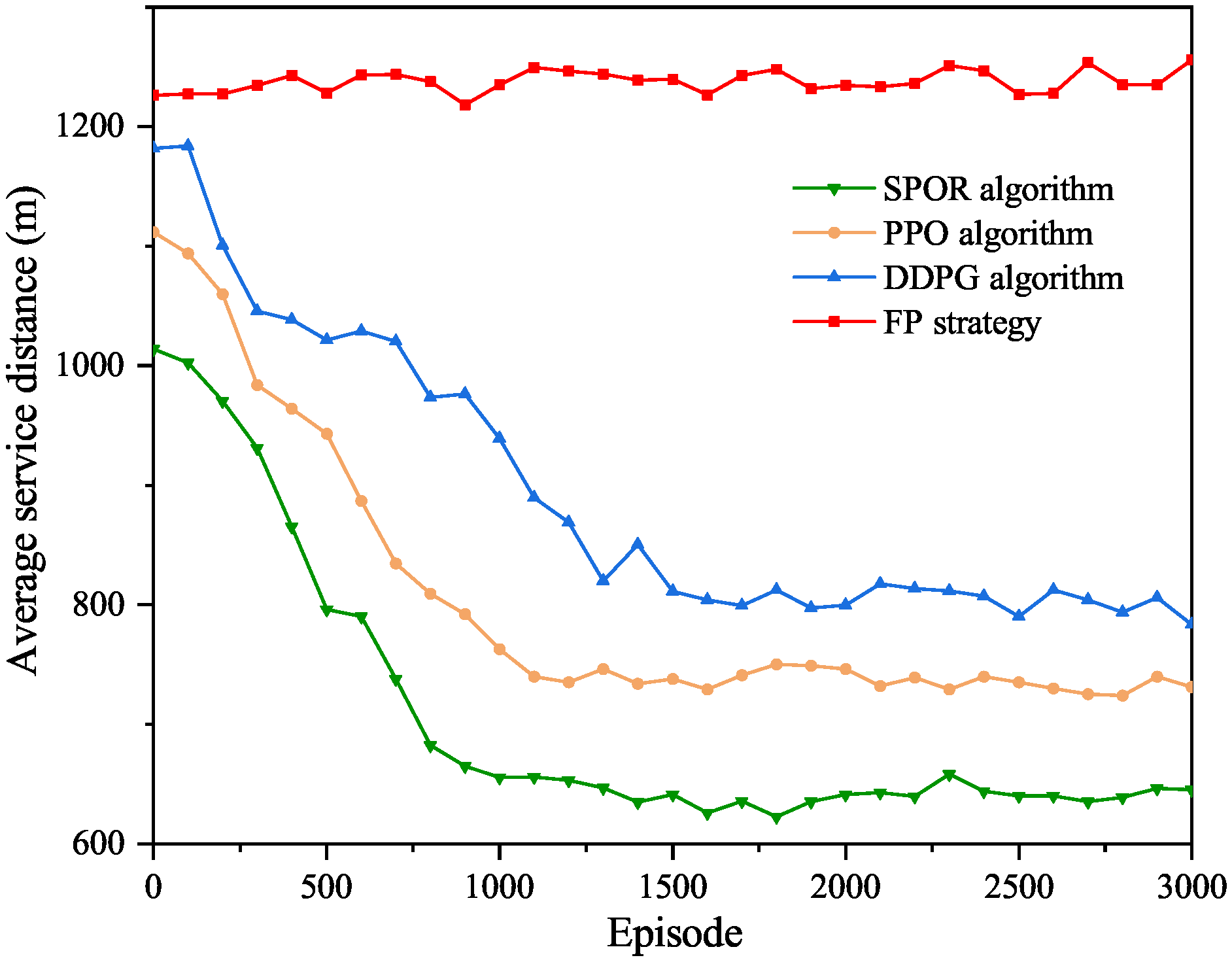 Figure 7 depicts the performance of each algorithm in optimizing the average service distance between the UAV and users with service demands. As shown in the figure, the proposed SPOR algorithm demonstrates superior distance optimization capability, reducing the initial average distance of approximately 1000 m to around 650 m after convergence. The PPO algorithm converges to an average distance of about 740 m, while the DDPG algorithm stabilizes at approximately 800 m. In contrast, the FP strategy fails to achieve effective distance optimization, with the average service distance remaining at a high level of around 1240 m throughout the training process. Compared with the DDPG and PPO baselines, the proposed algorithm reduces the average service distance by about 19% and 12%, respectively. It should be noted that the average service distance is not intended to measure coverage robustness in this paper. Instead, it reflects the spatial efficiency of the UAV in approaching demanding users during dynamic service provision.