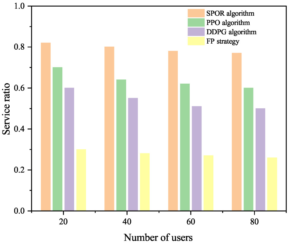 Figure 8 demonstrates the service ratio performance of four algorithms under scenarios with varying numbers of users. As shown in the figure, the proposed SPOR algorithm achieves the highest service ratio across all user population sizes. It attains a service ratio of about 0.82 when serving 20 users and maintains a relatively high level of around 0.77 when the number of users increases to 80, indicating strong scalability under increasing user demand. The PPO and DDPG algorithms achieve lower service ratios and exhibit a gradual decline as the user population grows. In contrast, the FP strategy provides severely limited service capability, with its service ratio remaining at a low level of about 0.26–0.30 and slightly decreasing as the number of users increases.