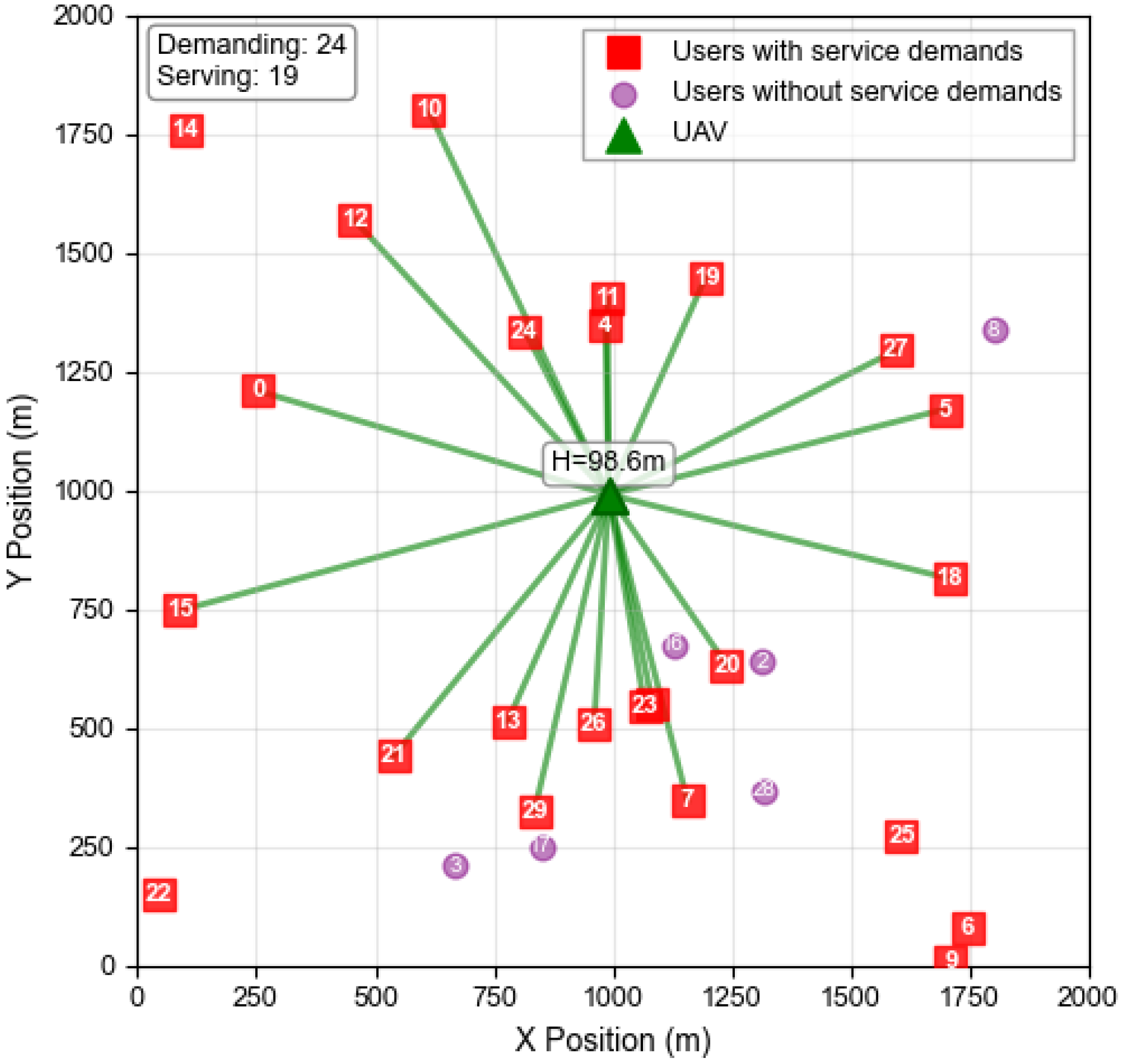 Figure 10 illustrates a scenario where a UAV provides services to users with service demands under the proposed method. It is generated from a representative snapshot of one simulation episode after policy convergence, where the UAV position, user locations, service-demand states, and established communication links are extracted from the simulation environment and then visualized. In the figure, the green triangle represents the position of the UAV, red squares denote users with service demands, and purple circles indicate users without service demands. The solid lines indicate communication links established between the UAV and the users. It can be observed that the proposed method enables the UAV to autonomously optimize its flight trajectory and dynamically adjust its position to achieve effective coverage for users with service demands. In this representative simulation snapshot, the system achieves a service ratio of 80 percent, indicating that the UAV can effectively respond to users with service demands under the learned policy.