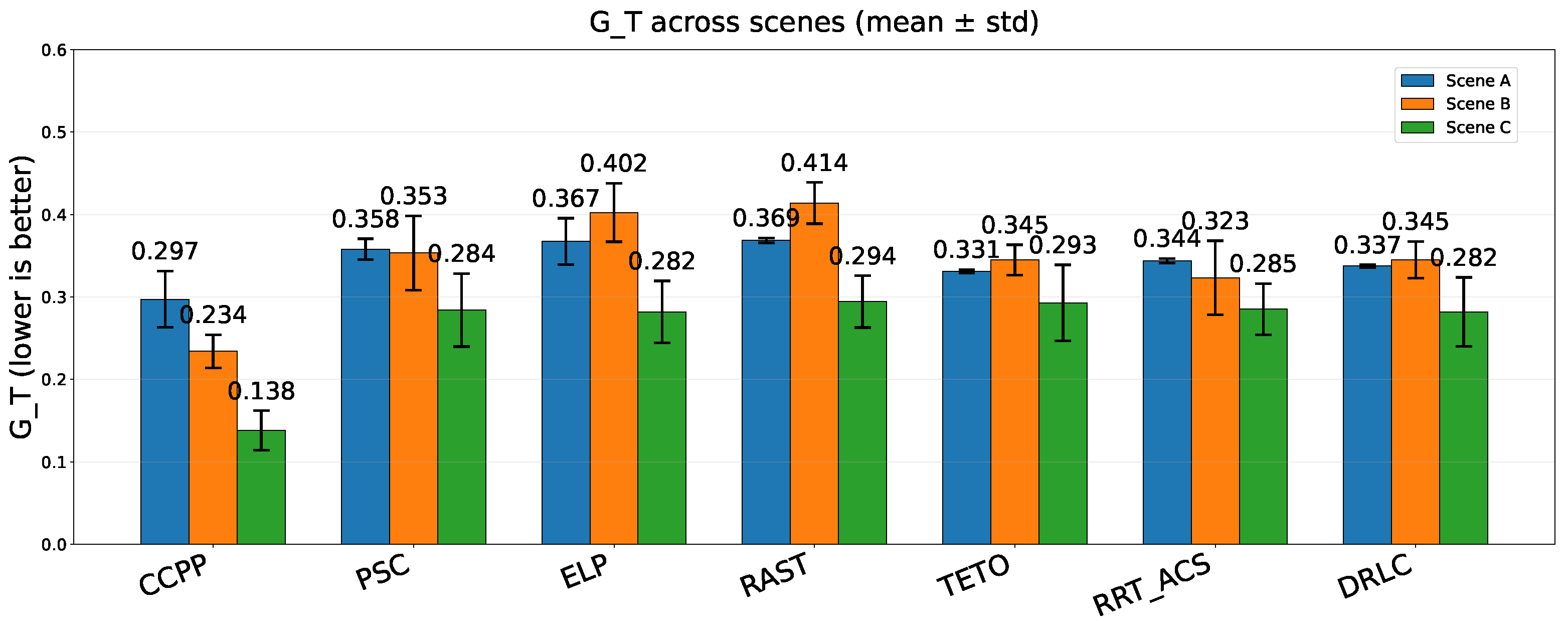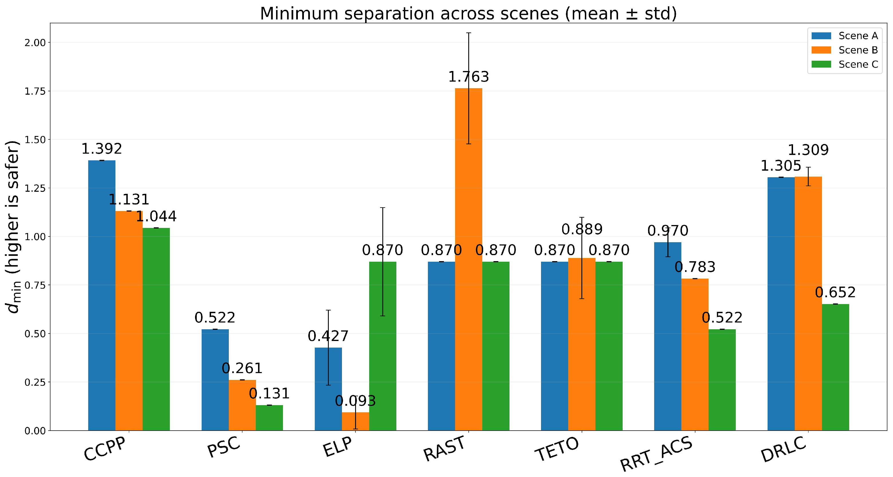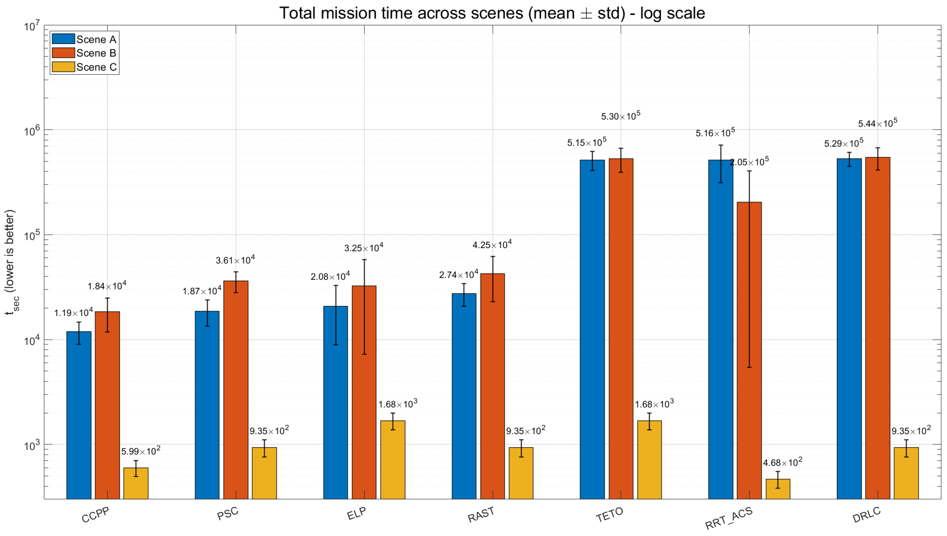 To evaluate the overall performance of the proposed CCPP and competing methods in heterogeneous UAV–USV collaboration, we conduct multiple independent trials for seven algorithms across three representative scenarios. Key metrics related to mission efficiency, safety, and constraint satisfaction are recorded. Given the large number of algorithm–scenario combinations, results for each metric are summarized using grouped bar charts, where bar heights represent the mean values over trials and error bars indicate the variability across trials. This allows for simultaneous assessment of average performance and stability. Unless otherwise stated, percentage improvements are reported relative to the strongest competing baseline (the best non-CCPP method) in the same scenario. The corresponding results are presented in