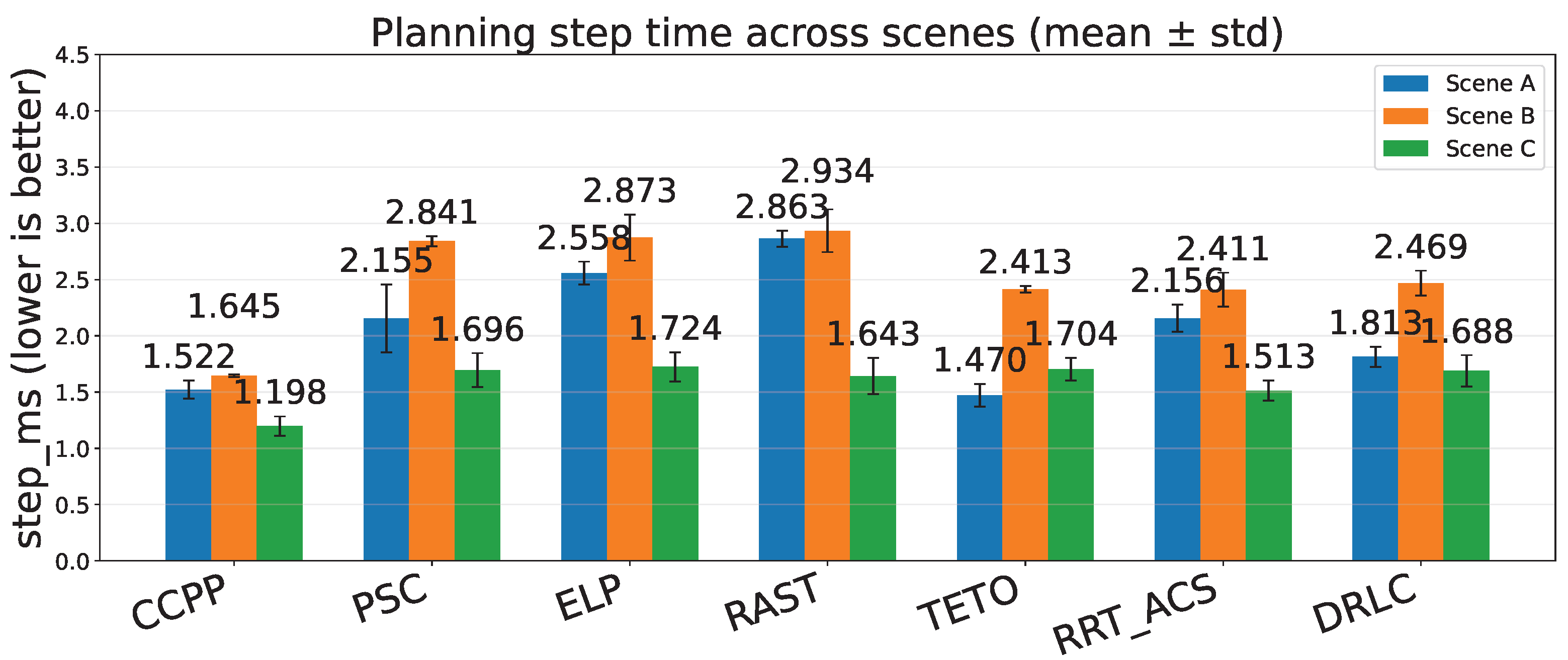 Figure 6, CCPP achieves the lowest or near-lowest millisecond-level step time across all scenarios. In